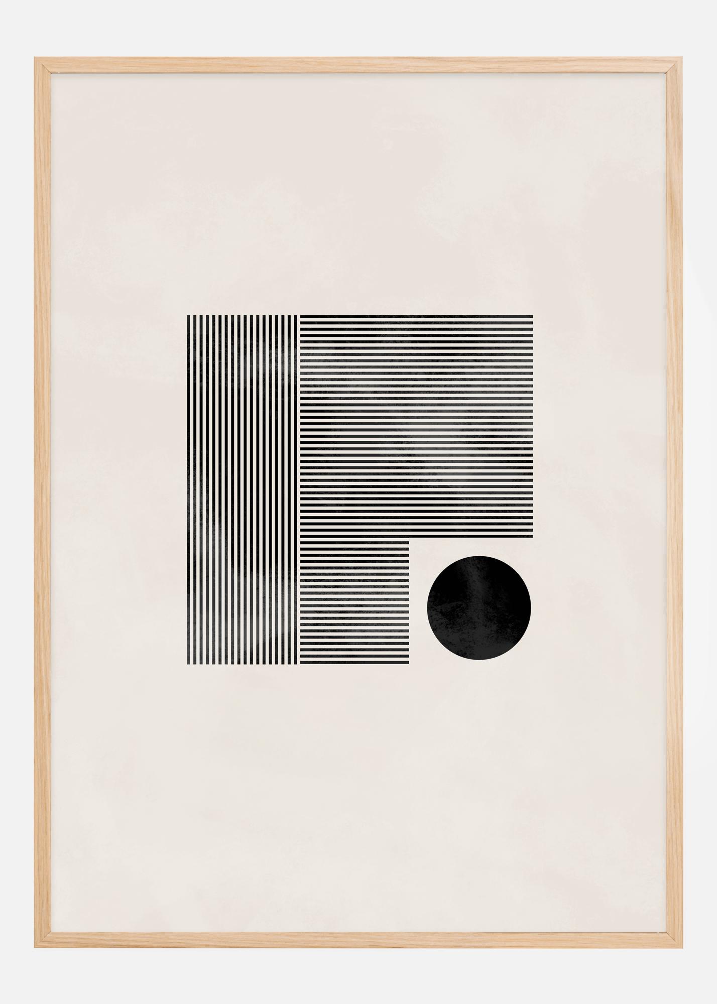 Šis stilingas ir minimalistinis plakatas vaizduoja geometrinį žaidimą tarp stačiakampių ir apskritimo, visi pavaizduoti drąsiomis juodomis linijomis ir formomis ant švelnaus, kreminės spalvos fono. Griežta stačiakampių linijų kompozicija suteikia tvarkos ir struktūros pojūtį, o vieniša juoda apskritimas įvedamas kaip netaisyklingumas, kuris sukuria vizualinį susidomėjimą ir balansą. Tai yra meno kūrinys, kurį galima vertinti dėl jo paprastumo ir gebėjimo papildyti įvairius interjero stilius.