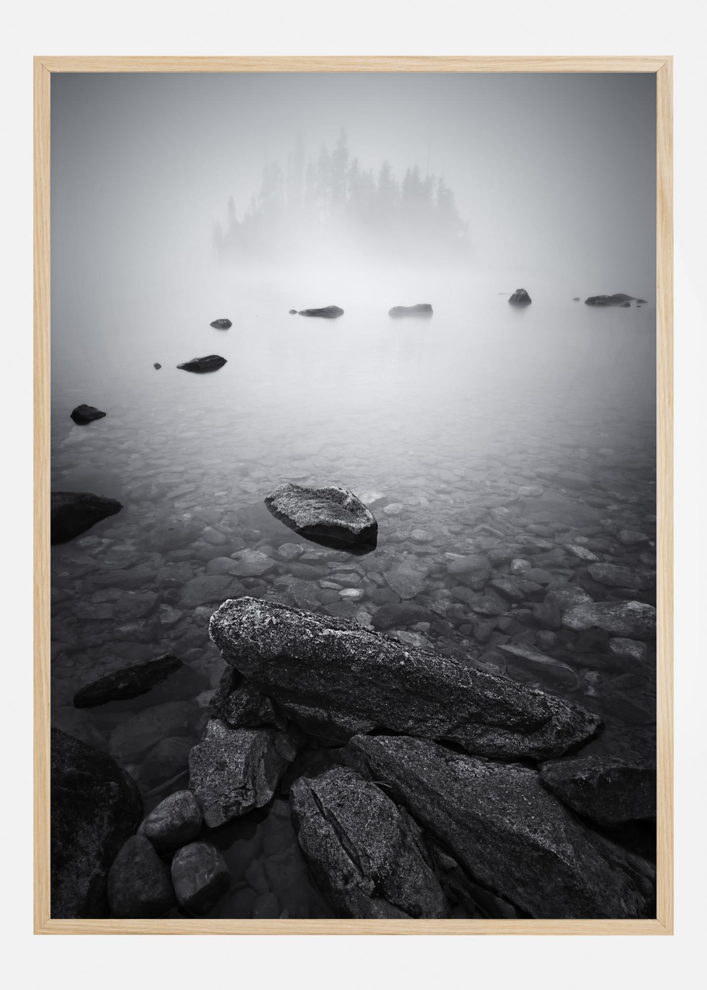 Mistinė gamtos plakatas su akmenimis ir rūku uždengtu ežeru. Įsivaizduokite, kas gali būti ten, kai žiūrite į rūku padengtą medžiuose paskendusią salą. Padarykite savo namus magiškus su šiuo nuostabiu spaudiniu ant mėlynos sienos.