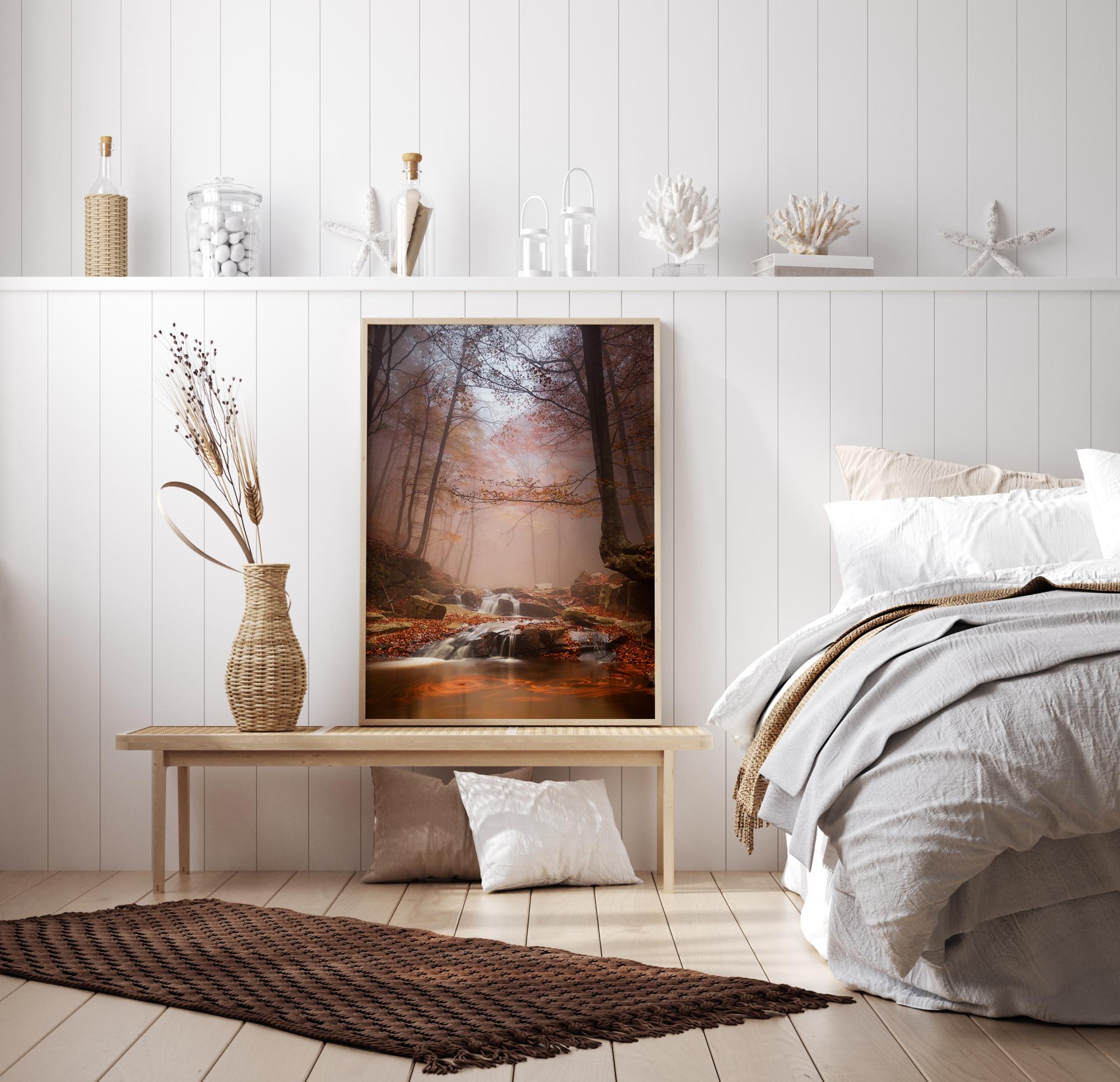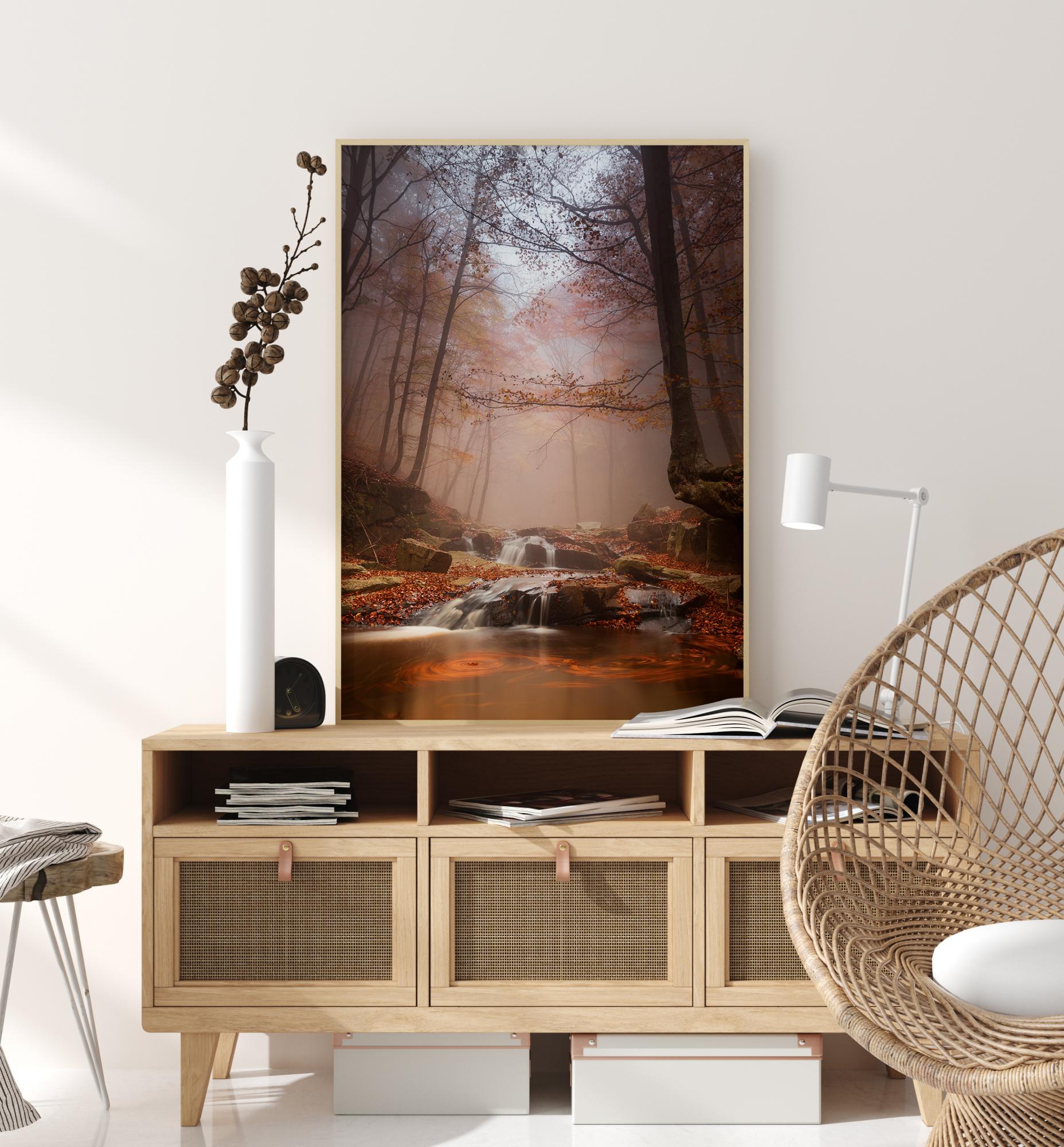 Vaizdingas rūko apgaubtos miško portretas su gražiu upeliu. Rūkas blokuoja tiesioginius saulės spindulius, ir tik kai kurie iš jų apšviečia miglotą mišką, išryškindami rudus ir geltonus lapus. Priešais matyti rudeninėmis spalvomis nudažyti lapai ant upės kranto. Šis plakatas yra paruoštas suteikti jūsų namams vaizdingą ir akmenuotą kalvotą miško vaizdą.