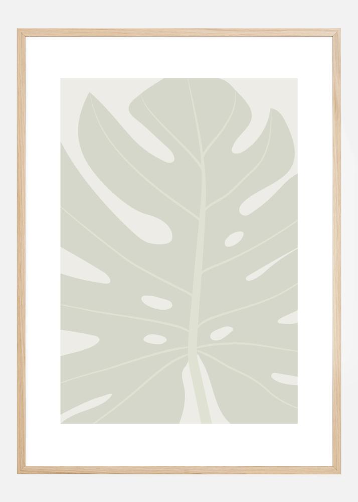 Įdomus plakatas su Monstera lapu, nupieštu ant tamsios stačiakampio formos ant baltos fono. Ant spaudos, pamatysite, kad lapo pjūvės kraštai gražiai išlenkti, o kai kurie jų iškirpti iš paveikslo. Akies formos vidurio struktūros suteiks jūsų namams įdomų pojūtį.