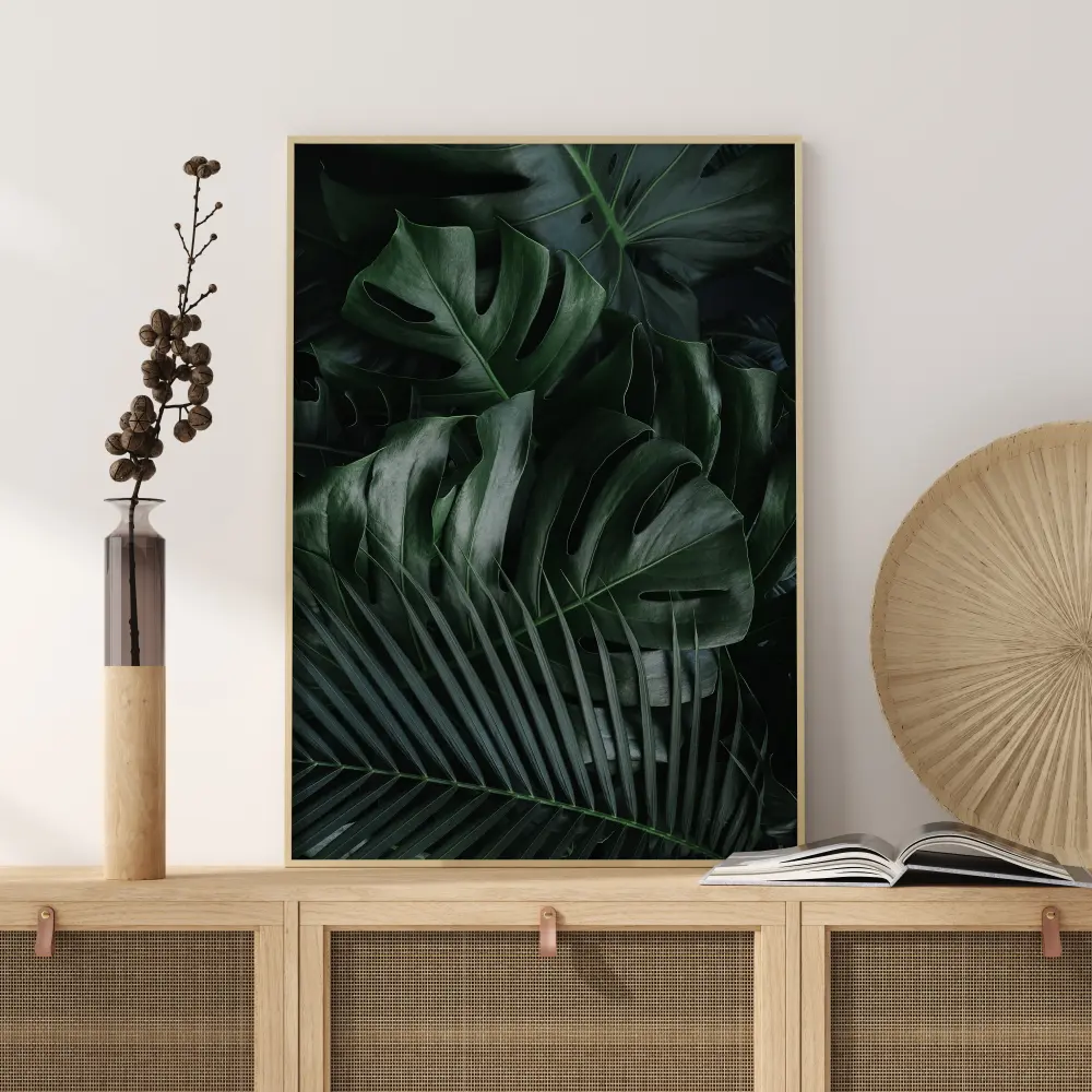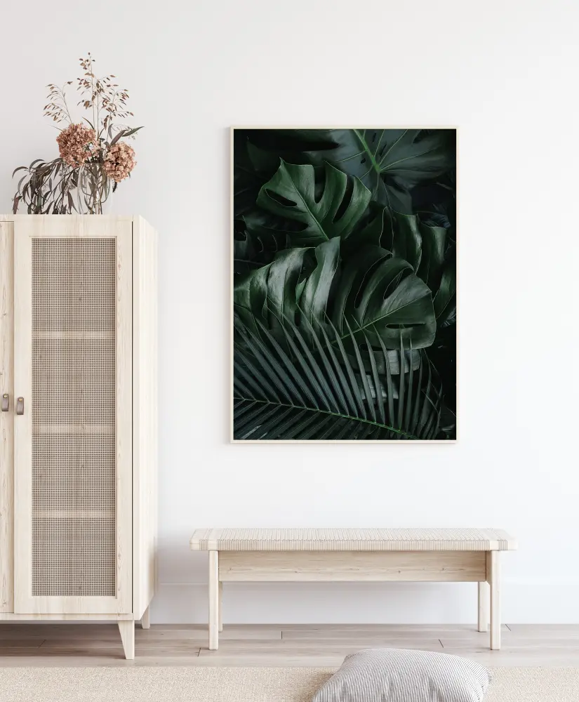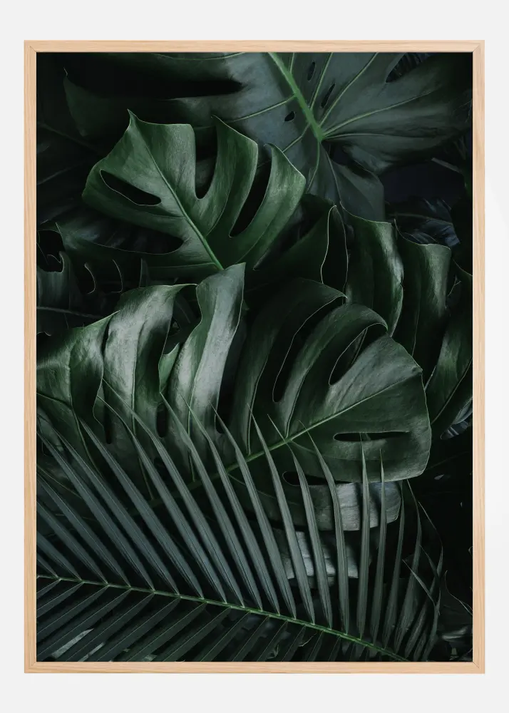 Lapų portretas su žaliais Monstera ir palmės lapais. Natūrali šviesa šviečia viršutinius monstera lapus ir sukuria tamsesnius atspalvius viršutinėje spaudinio dalyje. Dantyti lapai sukuria šiltą atpalaiduojantį jausmą. Puikus plakatas visiems, kurie myli augalus.