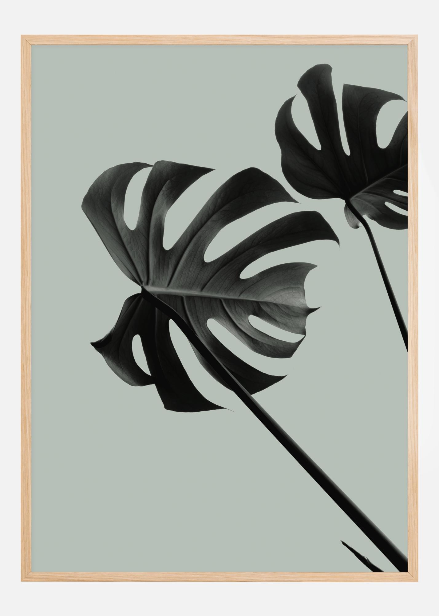 Juodai baltas arti darytas dviejų monstera lapų nuotrauka. Širdies formos lapai matomi šviesiai pilkame fone, o akimirką sustiprina šviesa už plunksnų formos raštų. Šis plakatas yra puikus būdas įnešti šių širdies formos lapų džiaugsmingą pojūtį į jūsų namus.