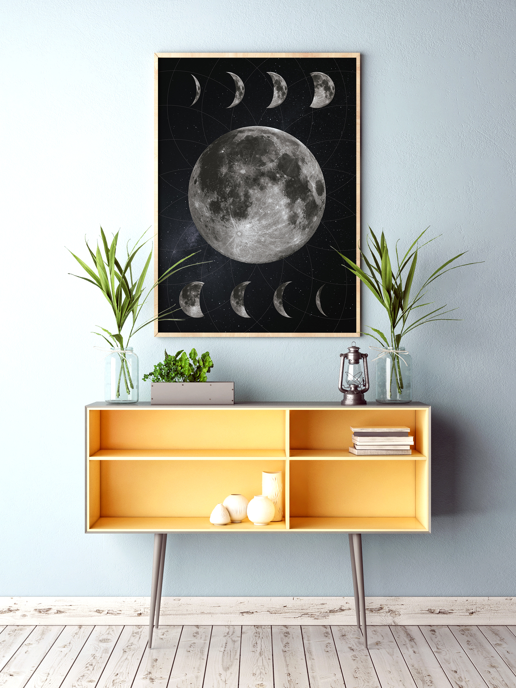 Kuris yra tavo mėgstamiausias dangaus kūnas? Šis stilingas atspaudas vaizduoja mūsų gražųjį mėnulį ir visas jo fazes, kaip jos atrodo, priklausomai nuo to, ar esi Žemės šiauriniame, ar pietiniame pusrutulyje. Pats mėnulis yra pilkai atspalvių, o žvaigždėtas dangus už jo švelniai pakrypęs link mėlynos.