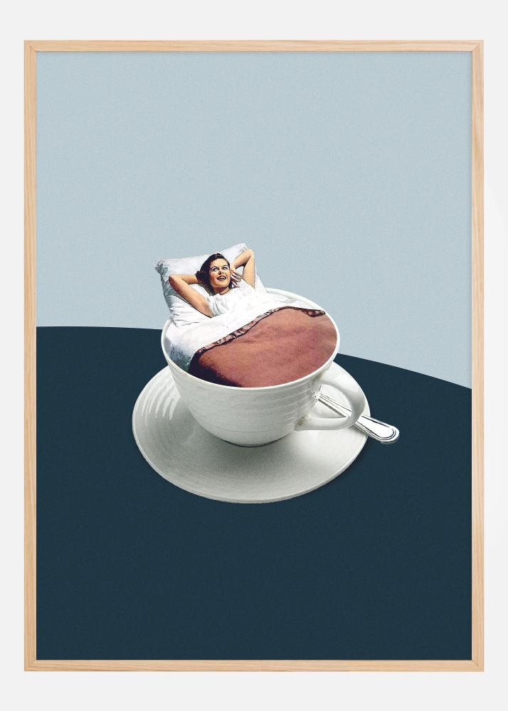 Šis originalus ir vaizduotę įkvėpiantis plakatas vaizduoja moterį, kuri, regis, mėgaujasi atsipalaidavimo akimirka neįprastoje aplinkoje: ji patogiai guli baltame puodelyje, pripildytame kavos, apsupta raminamos mėlynos erdvės, kuri nurodo naujos dienos aušrą. Puodelio dydis moters atžvilgiu sukuria siurrealistinį pojūtį, o jos atsipalaidavusi poza, apsivilkus patalynę, suteikia kasdienio komforto ir humoro prisilietimą scenai.