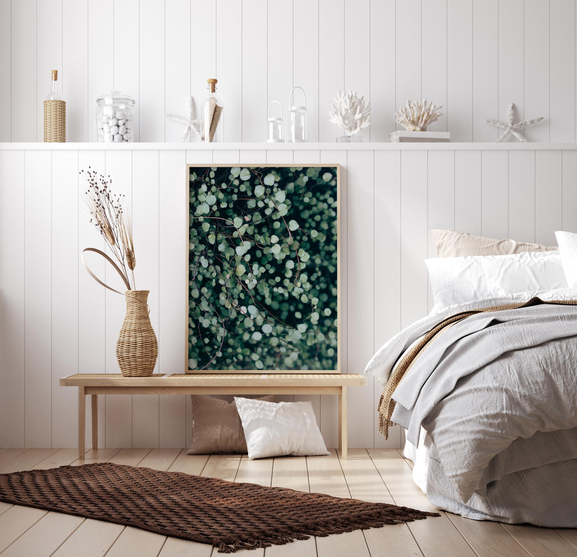 Gražus žalios spalvos artimo plano plakatas su vijokliu ir jo daugybe lapų bei šakų. Maži, apvalūs lapai linksmai spindi saulės šviesoje. Juodas fonas leidžia lapams puikiai išsiskirti. Pakabinkite šį atspaudą ant šviesiai žalios sienos, kad suteiktumėte raminančios atmosferos kambariui.