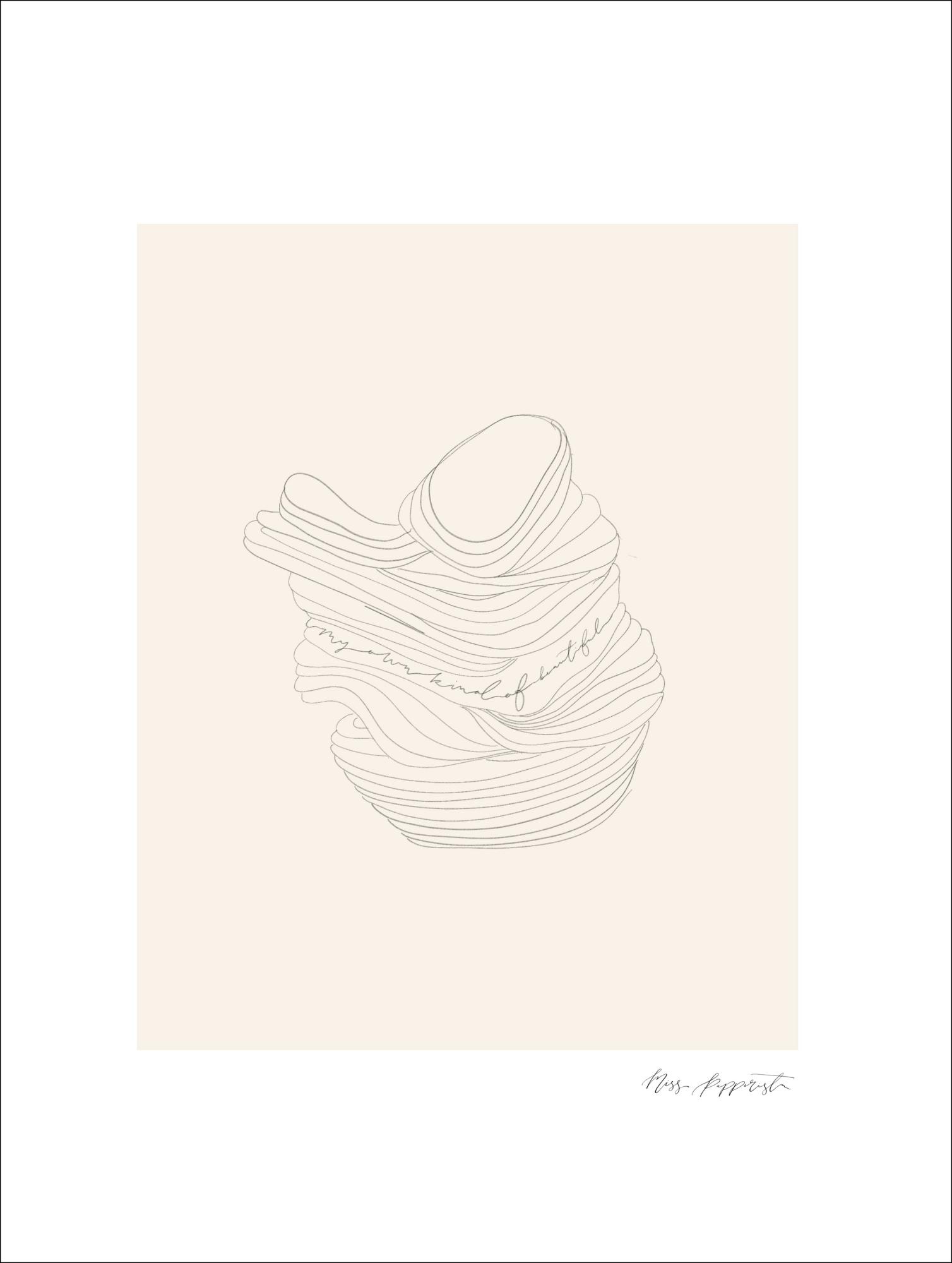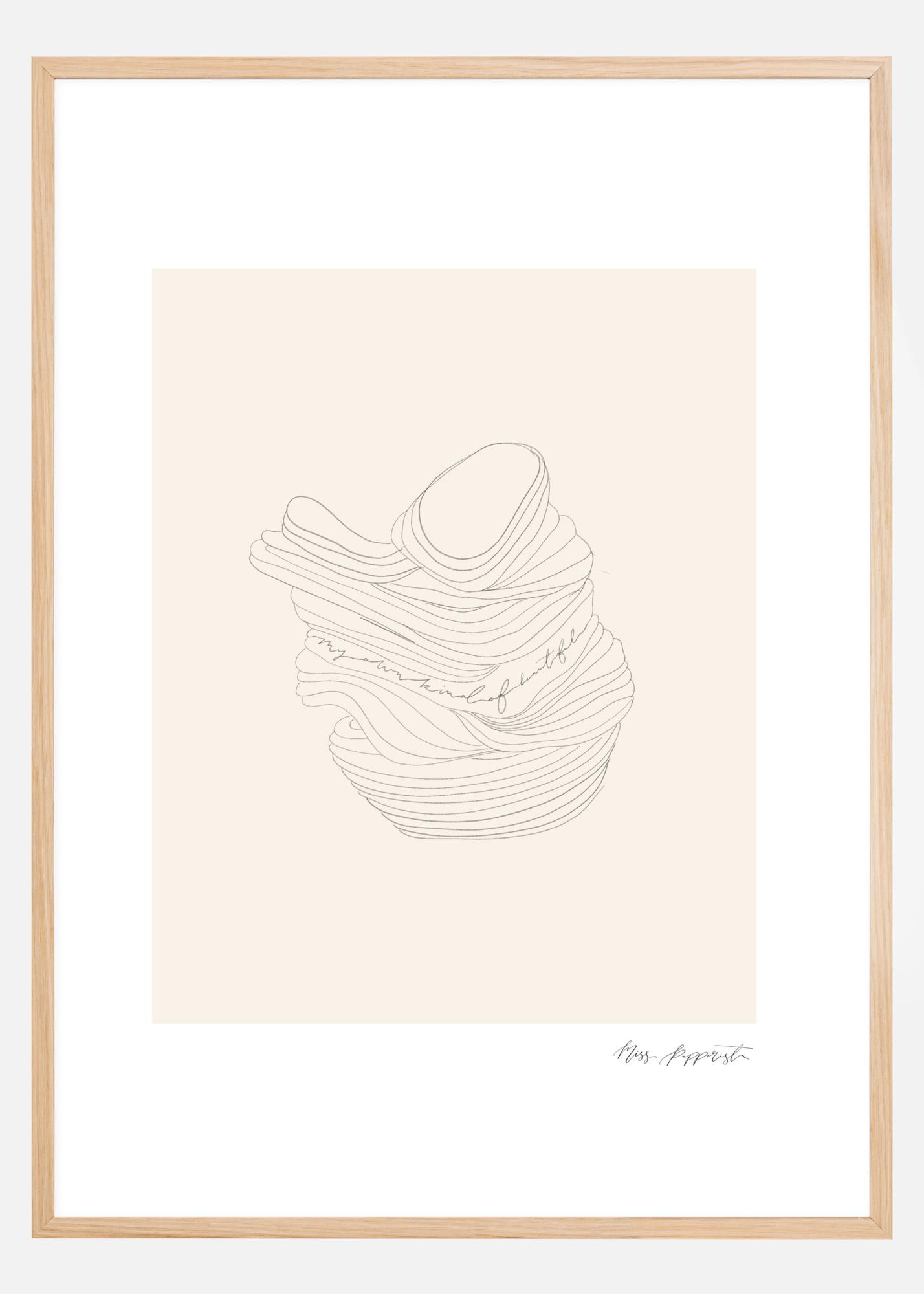 Įdomus piešinys iš sukrautų daiktų. Smėlinė spalvos fonas nukreipia žvilgsnį į juostuotą dubenį paveikslėlyje. Puikus atspaudas pokalbiui pradėti. Pakabinkite šį plakatą savo svetainėje ir pabandykite atspėti, kokie yra sukrauti daiktai.