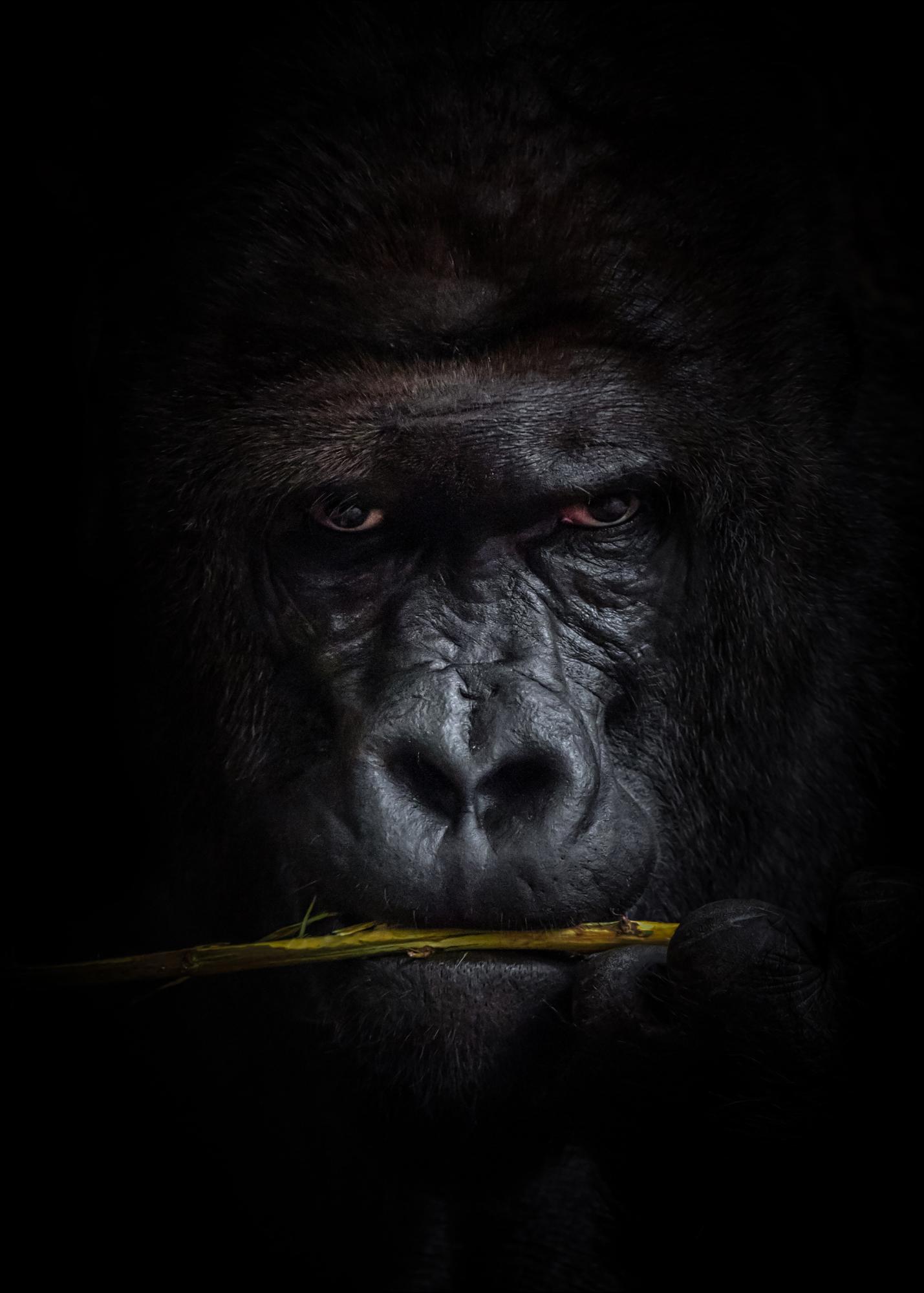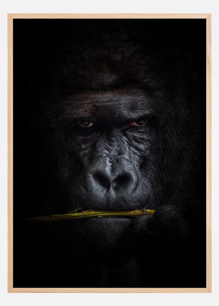 Stambaus planu gorilos portretas, kandantis šakos žievę. Žvilgsnis nukreiptas į fotografą, o tamsus kailis susilieja su juodu fonu, suteikdamas nuotraukai puikų gylį. Įspūdingas plakatas su intymiu susitikimu su vienu iš didžiausių atogrąžų miškų primatų.
