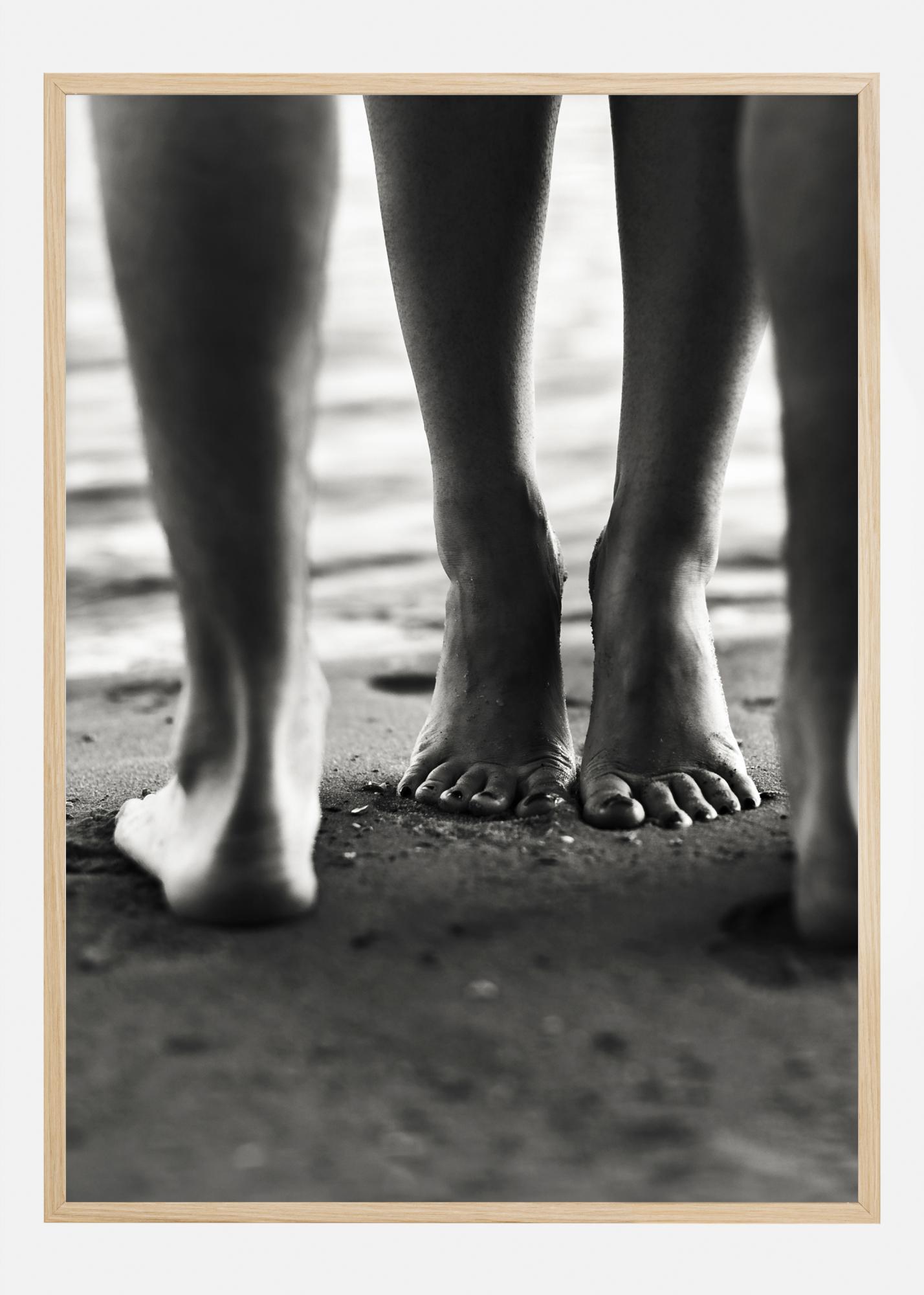 Romantiškas plakatas su nespalvota keturių kojų artimu vaizdu paplūdimyje. Nuotraukoje pavaizduoti du žmonės, stovintys atsisukę vienas į kitą. Žvilgsnis lengvai užkliūva už figūros, stovinčios ant pirštų galiukų. Šis gražus spaudinys suteikia romantiško jausmo ir tinka jūsų miegamajame, kai norite romantikos.