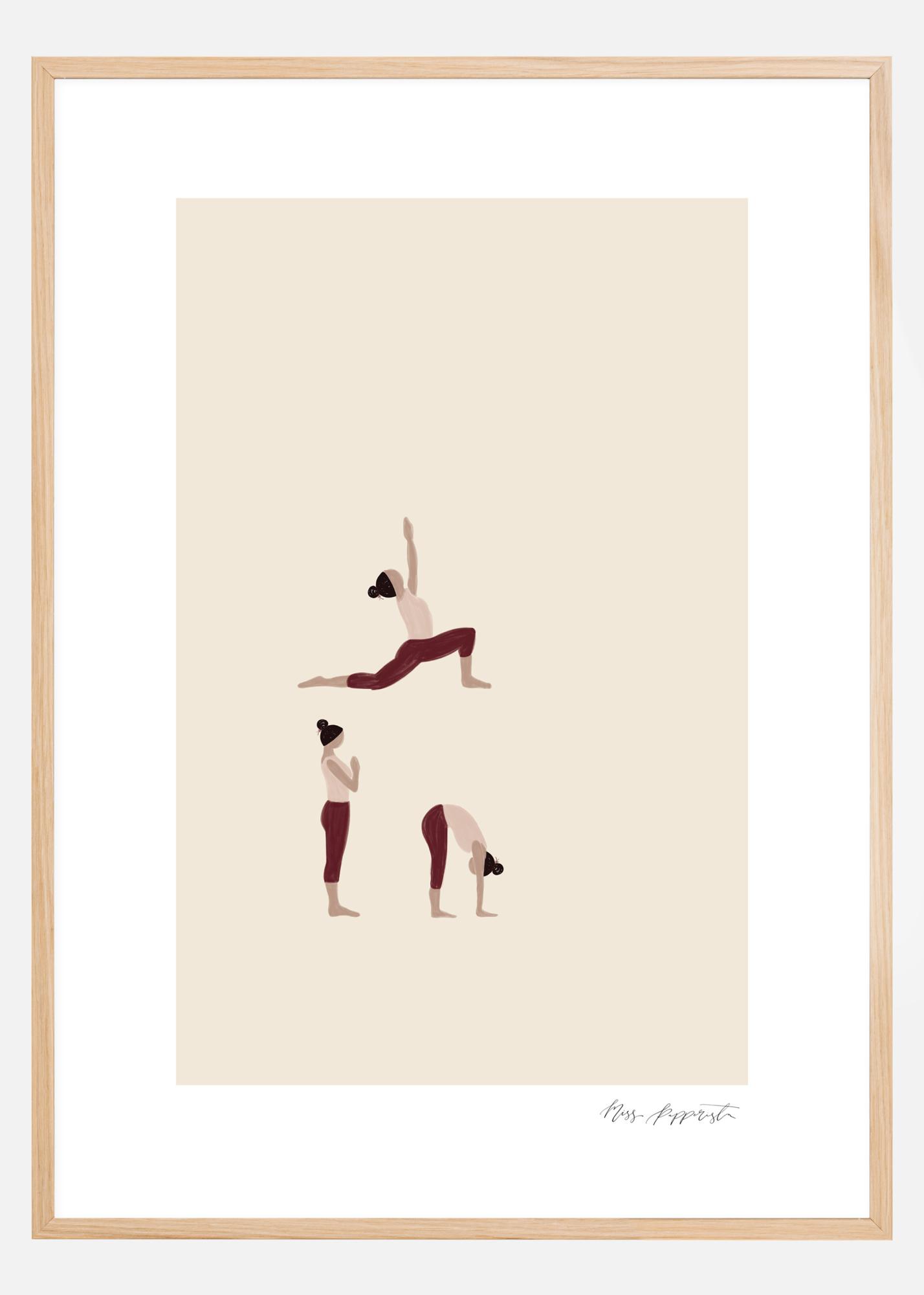 Meninis kūrinys su moterimi, praktikuojančia jogą. Kremo spalvos fone moteris stovi trijose skirtingose pozose. Moteris visas pozas atlieka tobulai. Puikus plakatas pakabinti jogos užsiėmimų klasėje arba sporto salėje.