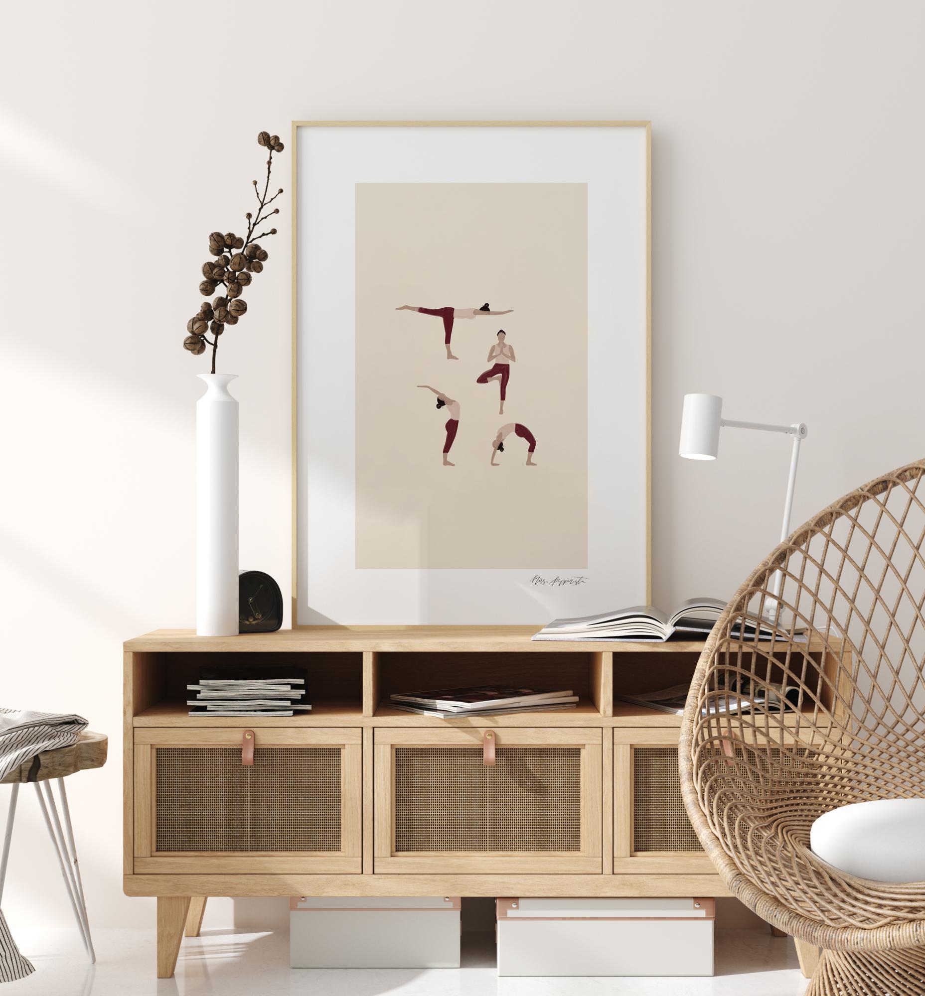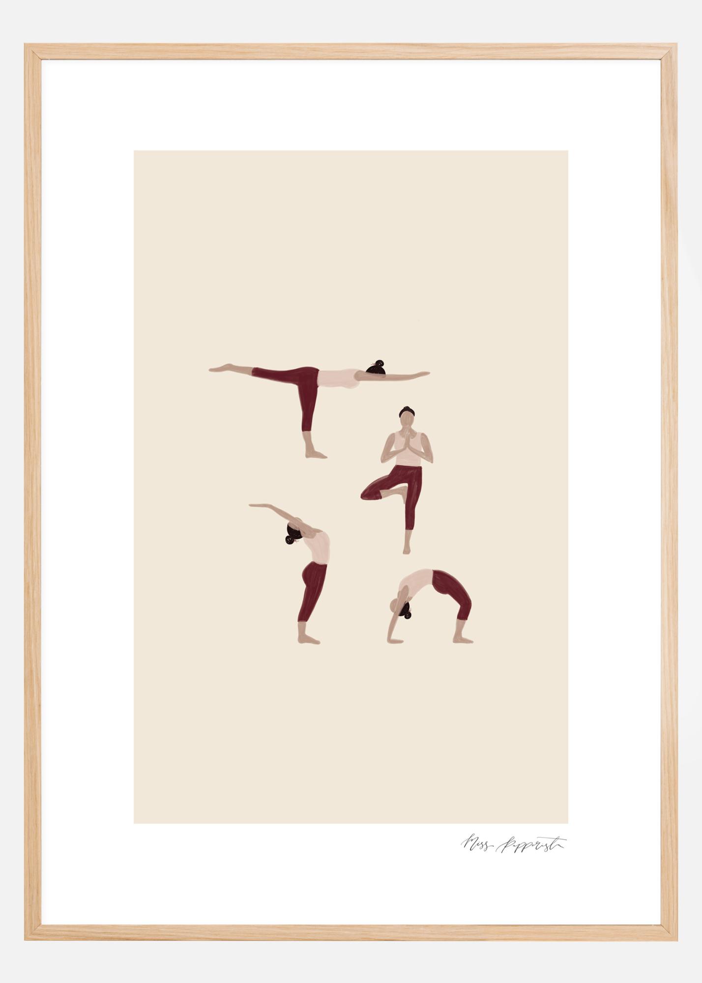 Informacinis plakatas gražiose pastelinėse spalvose, vaizduojantis keturias skirtingas jogos pozas. Paprastas ir elegantiškas paveikslas, sukurtas Miss Papperista. Derinkite su Miss Papperista plakatu Namaste ir Namaste II, kad sukurtumėte tą pačią temą turintį koliažą.