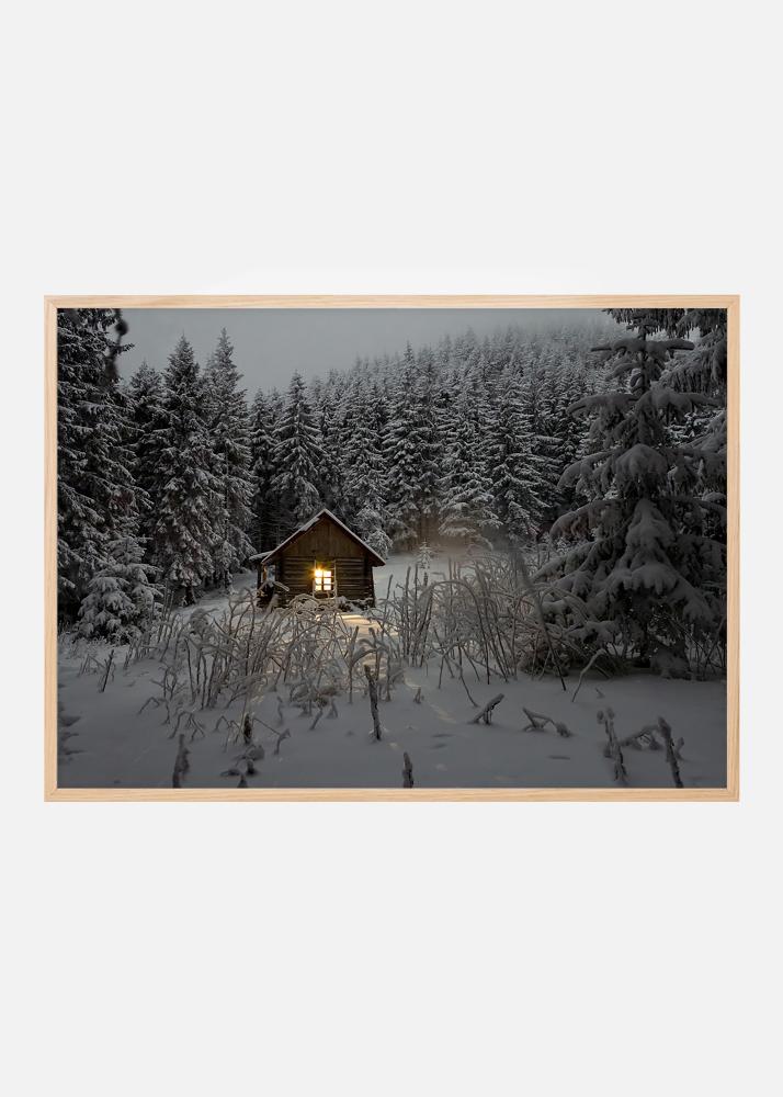 Plakatas su mielu mažo rąstų nameliu, apsnigtame miške, giliai eglyne. Šviesa iš lango, šviečianti šaltą žiemos naktį, suteikia nuotraukai gylį ir daro paveikslą įdomų. Nuotrauka tinka visiems interjero stiliams ir aplinkoms. Ji atrodo taip pat gražiai tiek plonesniame juodame metaliniame rėme, tiek solidesniame mediniame variante, arba kodėl gi neinarant šviesos paveiksle klasikiniame aukso rėme.