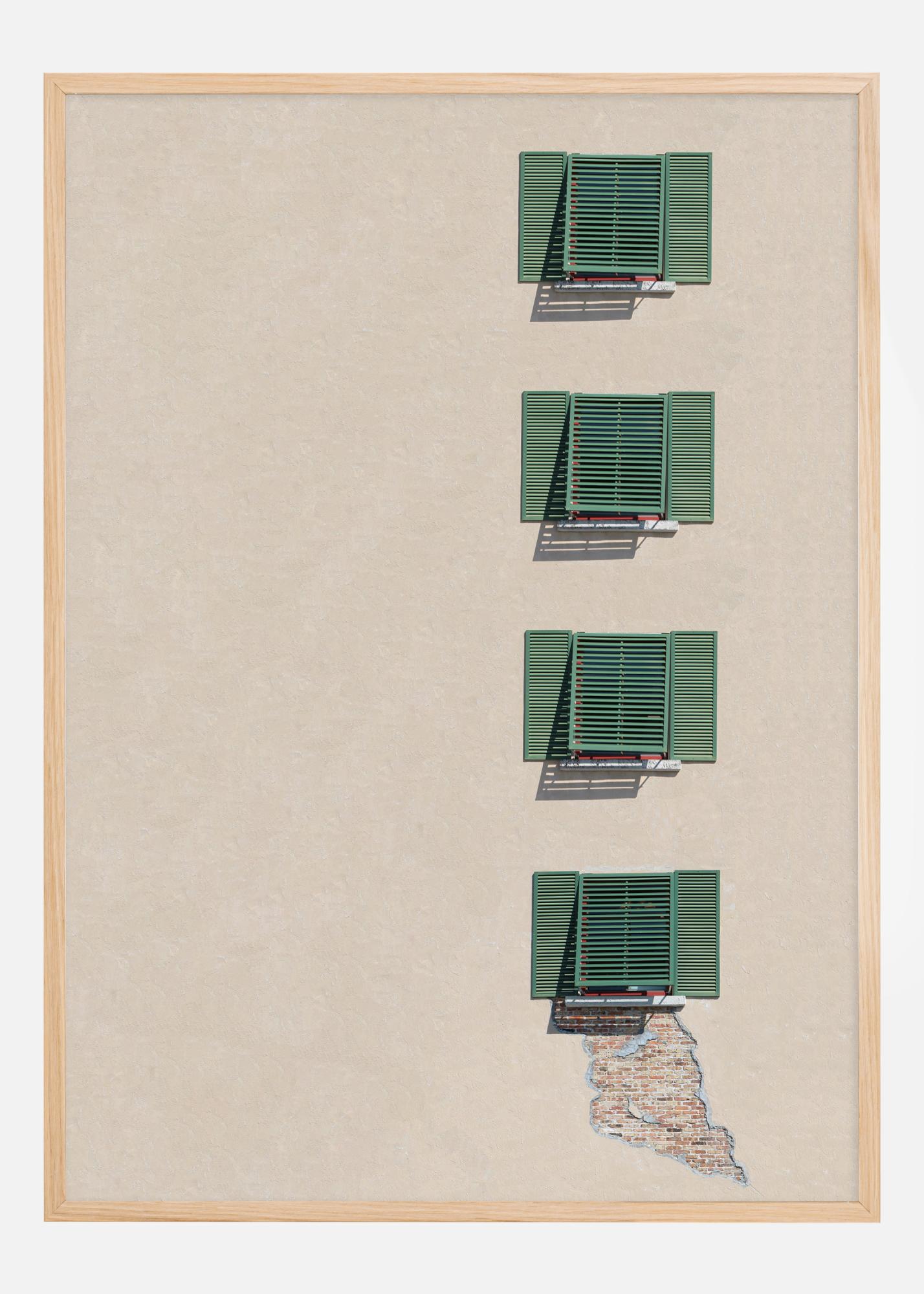 Kūrinyje, kuris gali būti pavadintas „Kaimynų ginčas“, pristatomas radikalus kontrastas tarp tvarkos ir chaoso, sinchronizuoti langinės, palyginus su paskutiniuoju langu, kurio dalis sienos atrodo sugriuvusi. Vienodos žalios langinės prieš vienos spalvos foną rodo tam tikrą nuspėjamumą ir rutiną, o sugadintas langas su matomomis plytomis pažeidžia šią harmoniją ir įveda galimo konflikto ar aplaidumo istoriją.