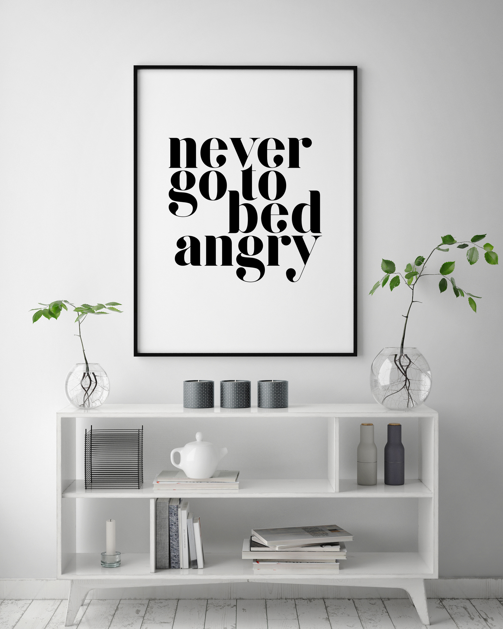 Plakatas su garsiąja fraze "niekada neik miegoti supykęs", atspausdinta mažomis raidėmis ir paryškintu šriftu. Raidės juodu rašalu baltame fone. Ant tavo miegamojo sienos šis plakatas visada primins tau būti ramybėje prieš einant miegoti. Tobulas spaudinys ramiam miegui.