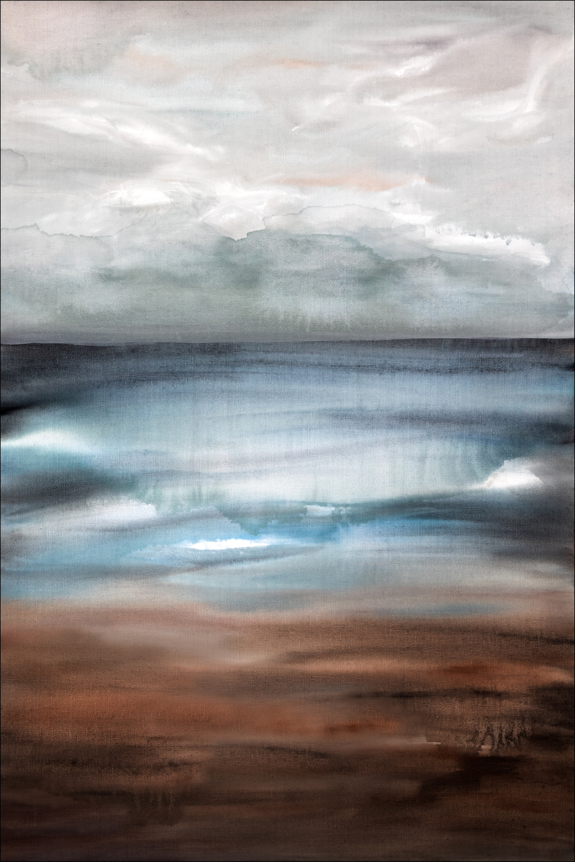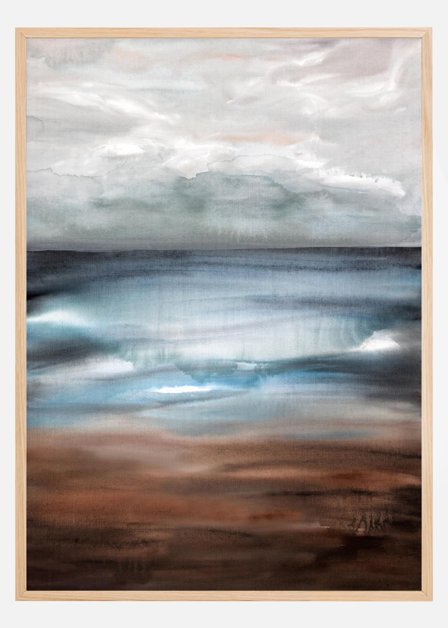 Atsipalaidavęs naujos dienos atspindys. Švelnios pastelinės spalvos rodo debesuotą rytą su rūku virš jūros. Horizontas puikiai susilieja su pilkais ir baltais debesimis. Su šiuo atsipalaidavimu ir raminančiu plakatu ant sienos galite beveik išgirsti jūrą.