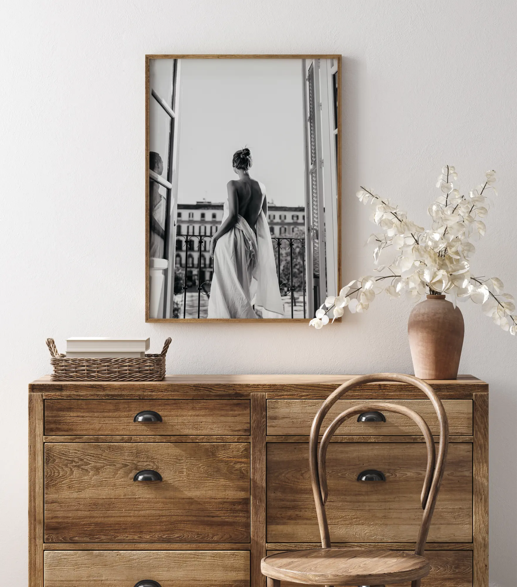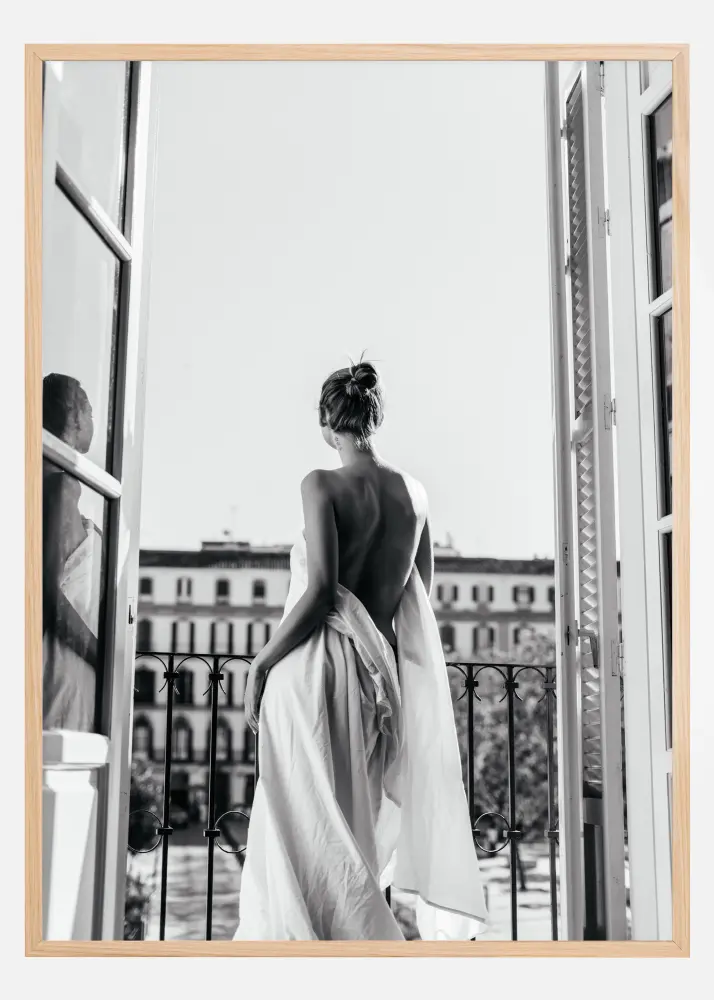 Seksuali juodai balta stambaus plano plakatas su moterimi, stovinčia balkone baltoje rankšluostyje. Su į kuodą surištais plaukais moteris atrodo besigrožinti vaizdu. Moteries atspindys lange sukuria jausmingą įspūdį. Tai yra jausmingas ir gražus vaizdas, tinkamas pakabinti ant jūsų miegamojo sienos.