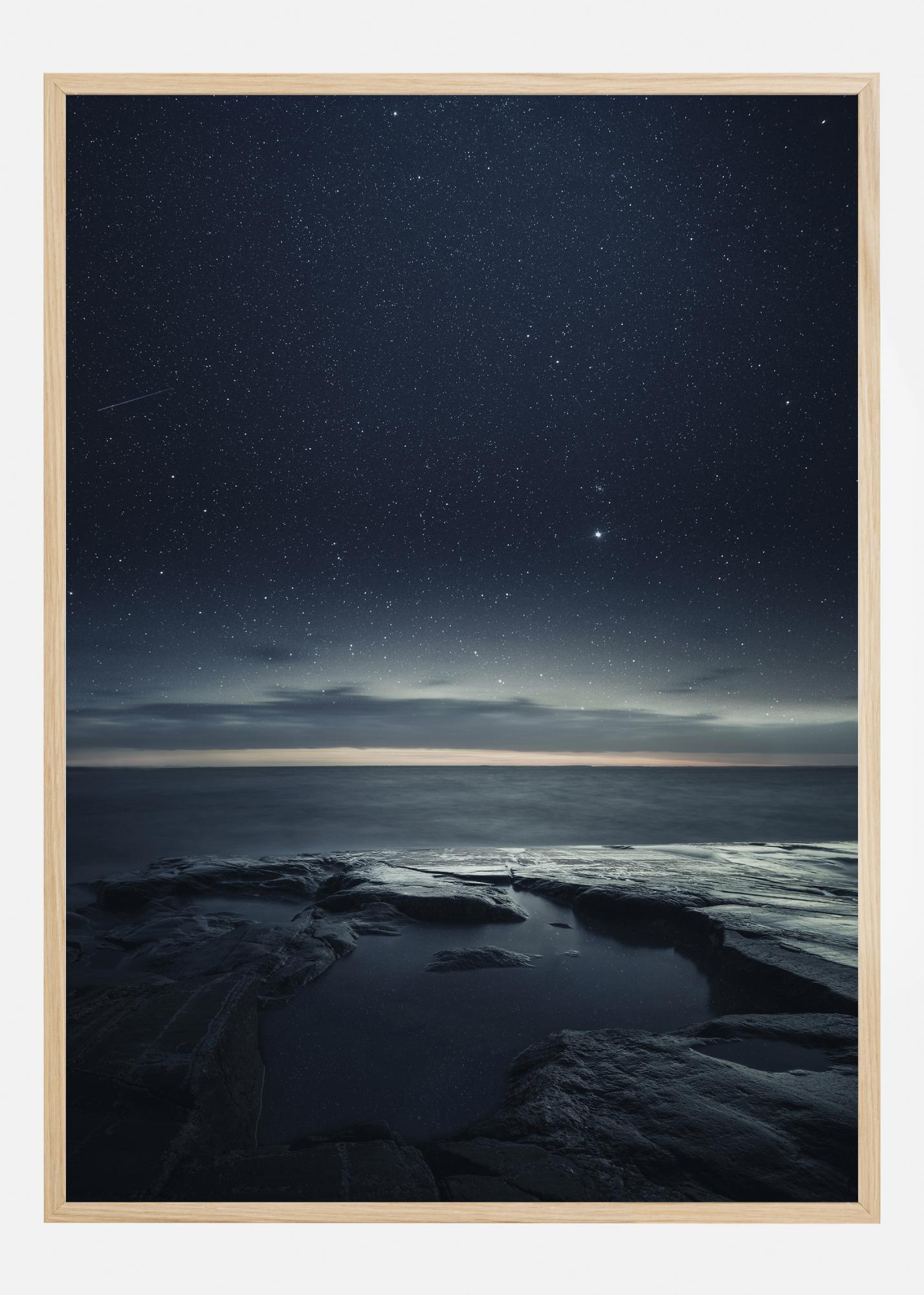 Nuostabus uolėtos pakrantės atspausdinimas su vandeniu, atspindinčiu skaidrų violetinį dangų su spindinčiomis žvaigždėmis. Horizontas aiškiai matomas dėl baltos šviesos spindulio, besitęsiančio virš jūros. Tai retas plakatas su vakaro magija, pasiruošęs suteikti šiek tiek energijos jūsų namams.