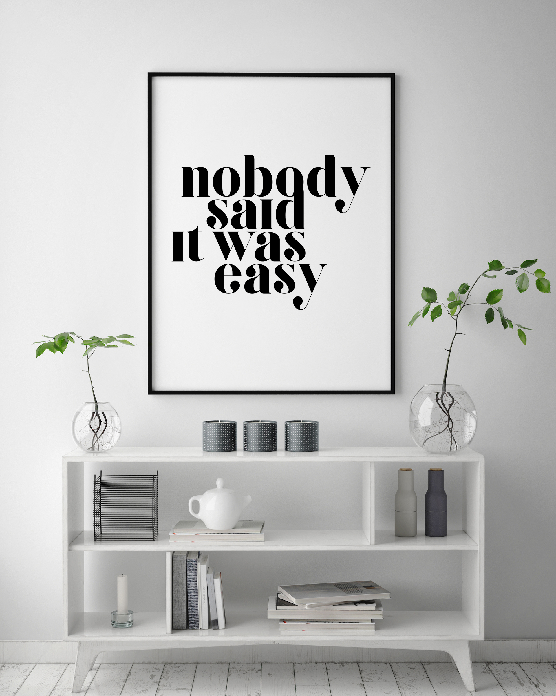 Spausdintas plakatas su citata "niekas nesakė, kad tai lengva". Užrašyta ant balto fono, juodu šriftu parašyta drąsi frazė. Paprasta, bet efektyvi skatinanti žinutė. Puikus plakatas, kuriuo galima papuošti darbinę aplinką.