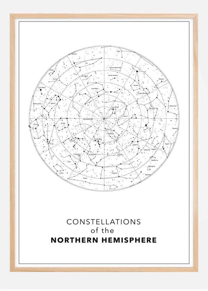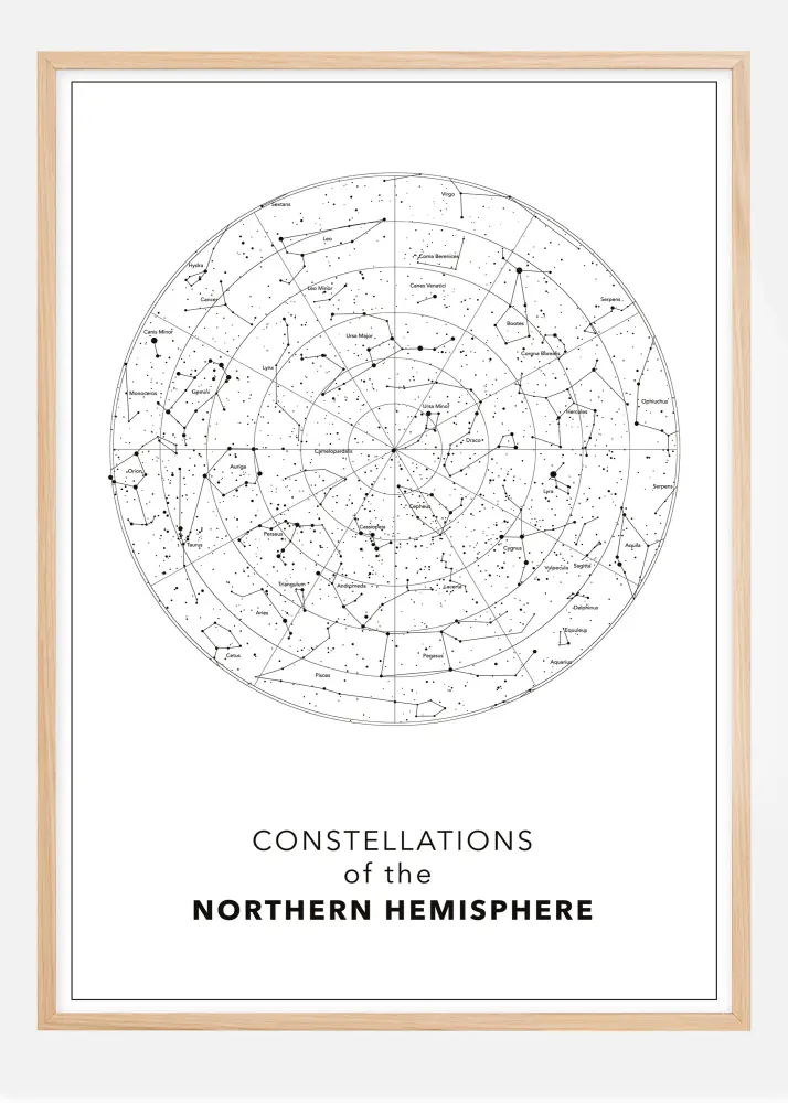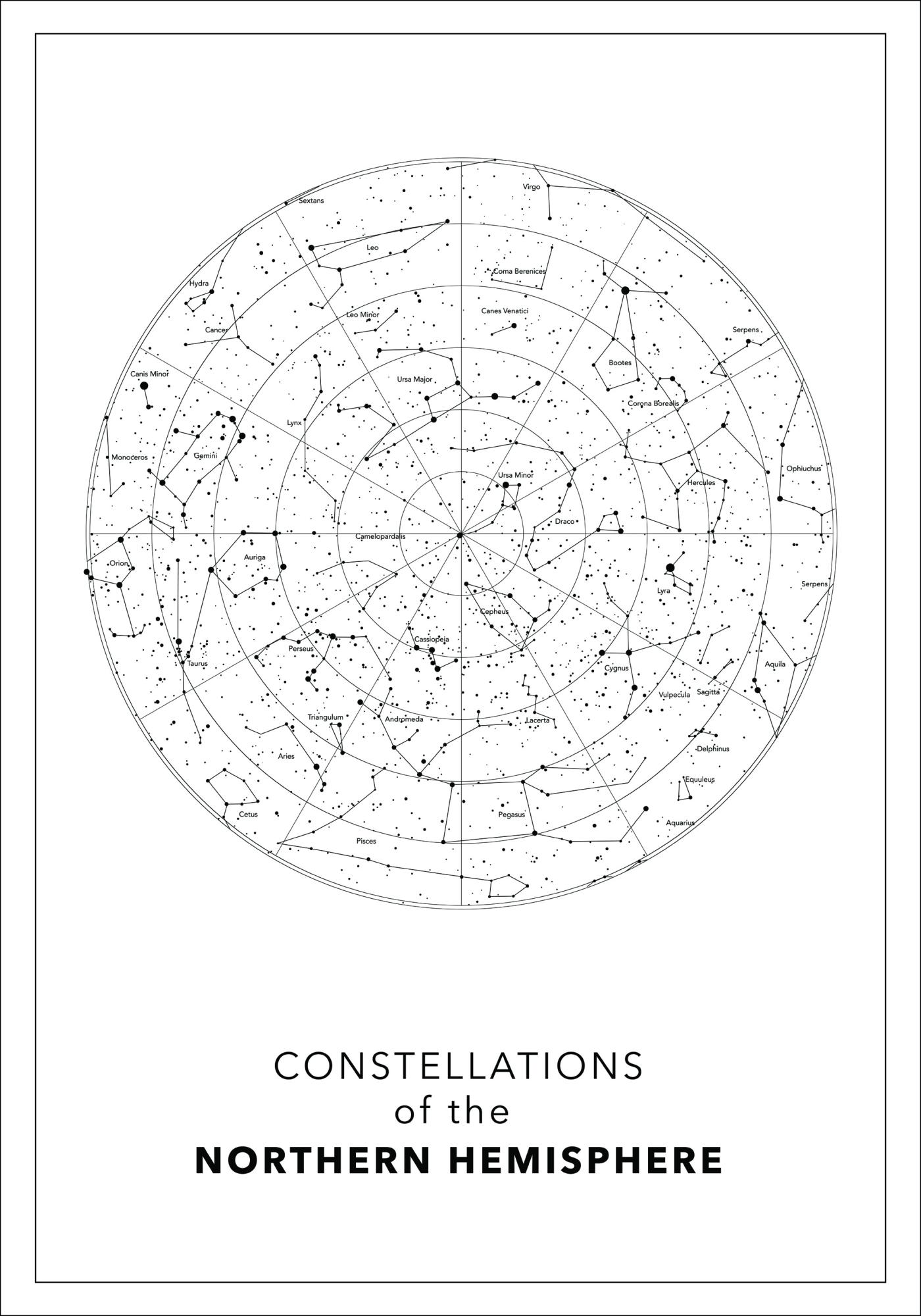 Žavus apskritas žvaigždynų žemėlapis šiaurės dangaus sferoje. Ant balto fono ilgumos ir platumos nubrėžtos juoda spalva, ir po kiekvienu žvaigždynu parašytas jo pavadinimas. Šį žavų spaudinį puikiai tinka kabinti bibliotekoje ar privačiame skaitymo kambaryje.
