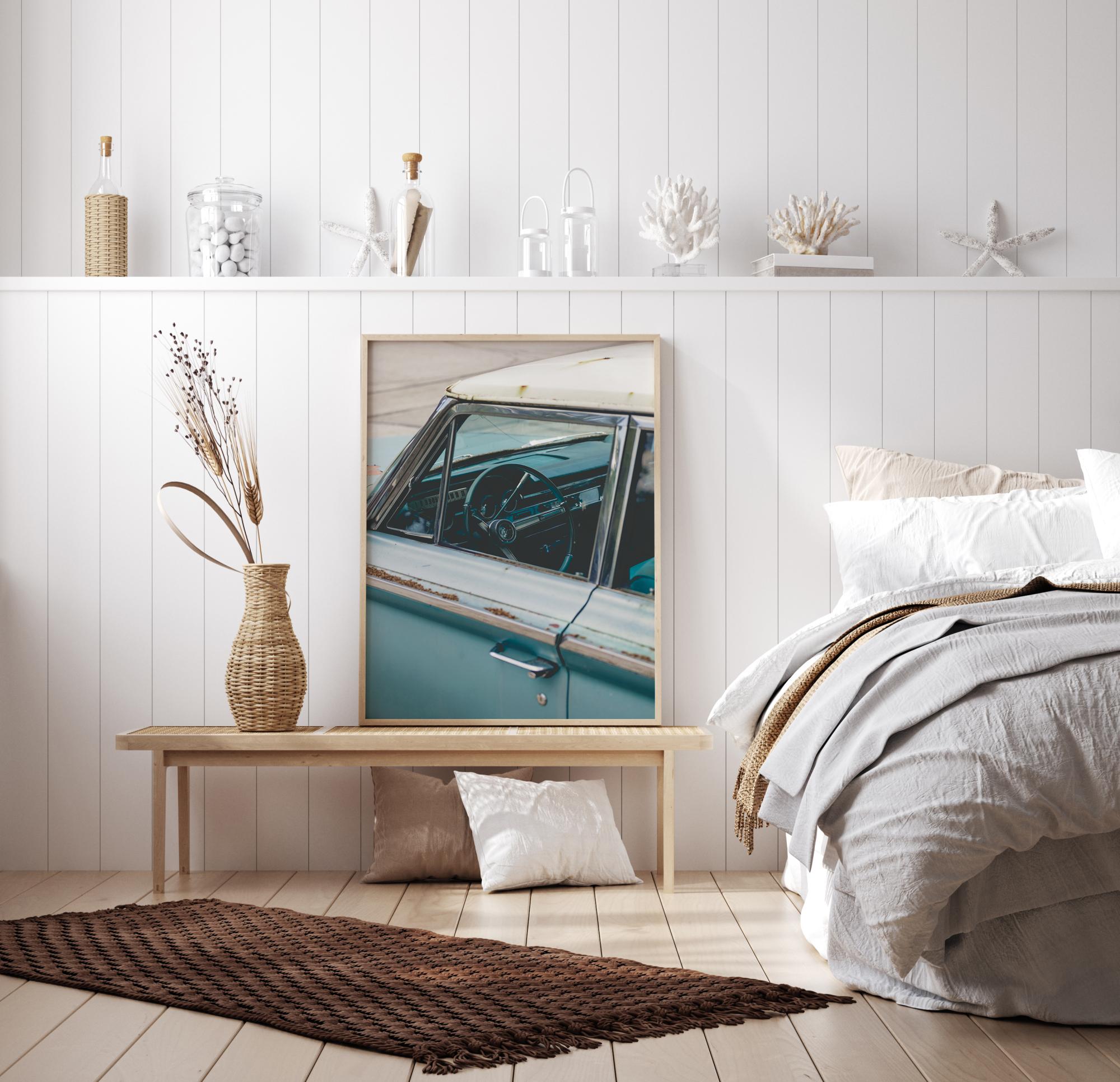 Nuostabus artimojo plano plakatas, rodantis surūdijusį seną automobilį su vintage stiliaus vairu ir spidometru. Šviesiai mėlynas automobilio modelis mus grąžina į 1950-uosius su šauniausiais automobilių modeliais. Puikus spaudinys pakabinti aplinkoje su vintage stiliaus.