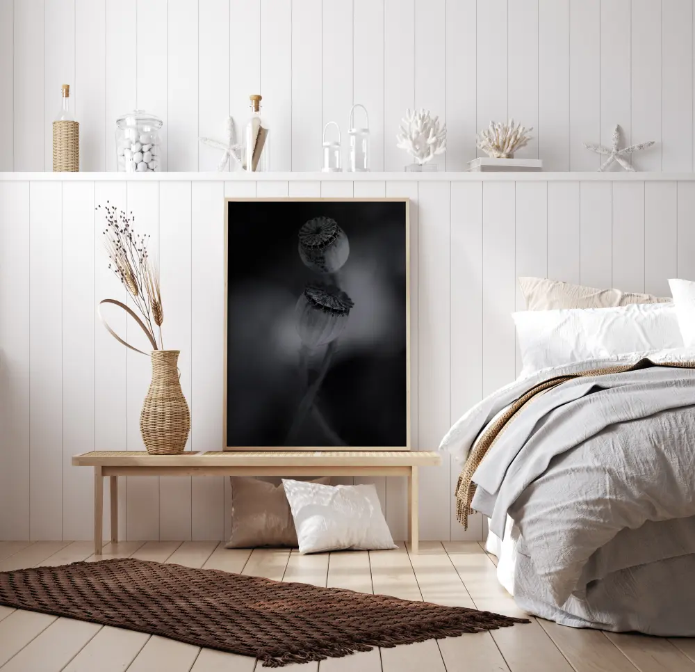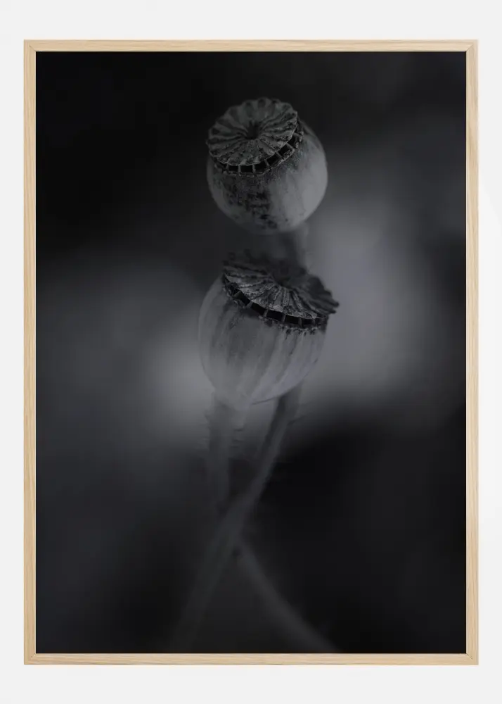 Neįtikėtinas nespalvotas artimo plano plakatas su dviem nužydėjusiomis aguonomis. Dvi sėklų dėžutės susipina tarpusavyje, o natūrali šviesa sukuria neryškų juodą foną. Šviesa tuo pačiu metu pabrėžia augalų grožį. Įneškite ramybės į savo namus su šiuo spaudiniu.