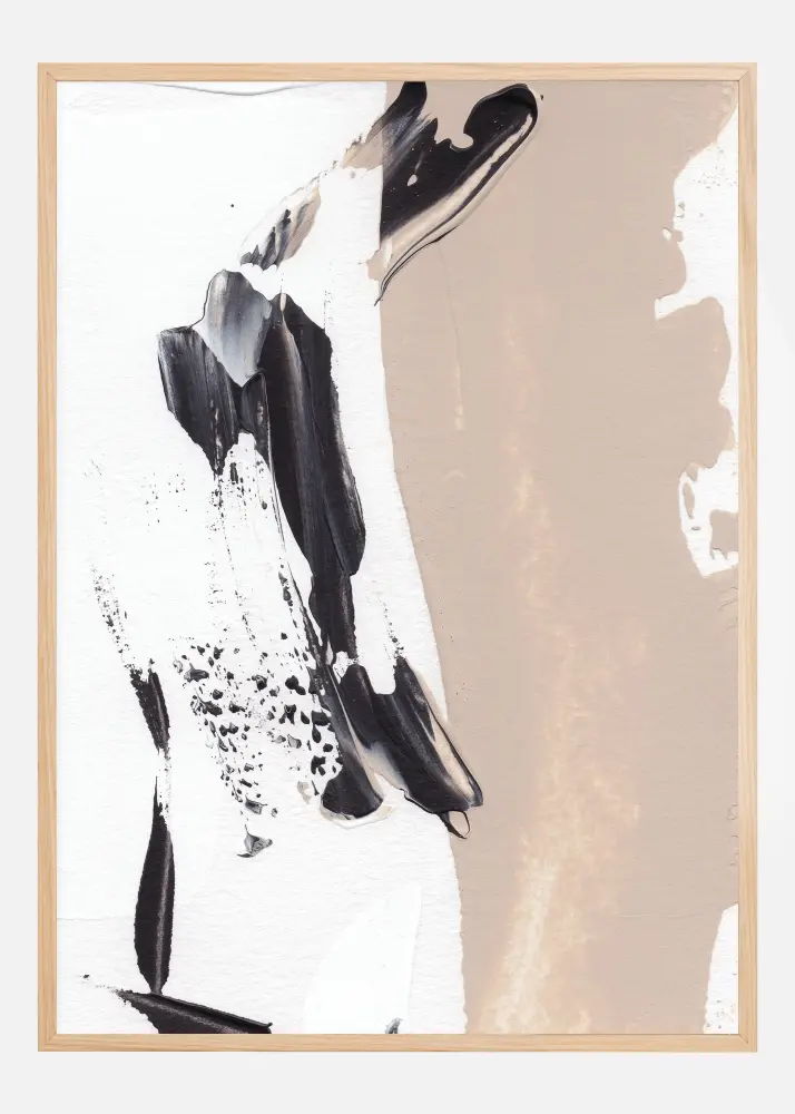 Šis drąsus ir ekspresyvus plakatas yra abstrakčiojo meno šventė ir jo gebėjimas sukelti emocijas bei interpretacijas. Dinamiška juodų ir pilkų teptuko potėpių kompozicija prieš kreminį foną iliustruoja judėjimą ir kūrybiškumo nepastovią prigimtį. Išsibarstę taškai ir lašai suteikia organiškumo pojūtį ir parodo menininko ranką kiekvienoje linijoje ir formoje.