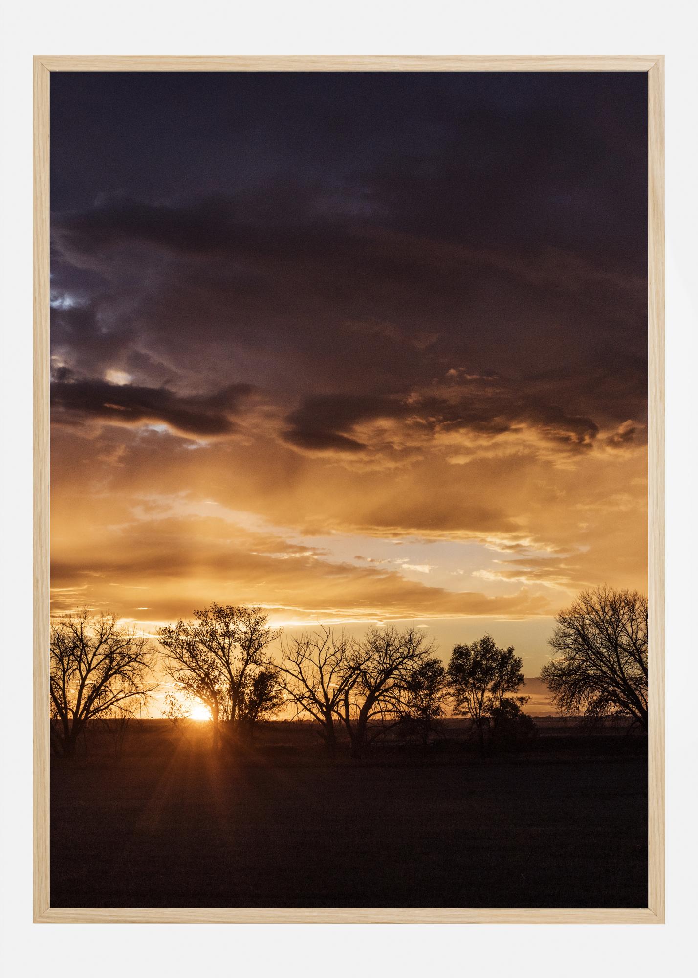 Kvapą gniaužiantis oranžinės saulėlydžio spausdinimas. Saulėlydis horizonte pabrėžia rudeninius medžius laukuose. Su įspūdingu dangumi oranžiniai atspalviai sukuria šiltą ir raminančią atmosferą. Nuostabus plakatas, suteikiantis šilumą jūsų svetainėje.