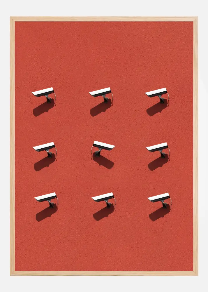 Gili raudona atspalvis fone kuria stiprų kontrastą su nespalvotomis kameromis, sukeldama budrumo ir rimtumo jausmą. Šis printas puikiai tinka modernaus interjero erdvei, kurioje menas susitinka su visuomenės klausimais, ir yra idealus pokalbio tema biurui, studijų kambariui arba svetainei. Leiskite šiam plakatui tapti jūsų interjero dalimi ir įkvėpti diskusijoms bei sąmoningumui apie pasaulį, kuriame gyvename.