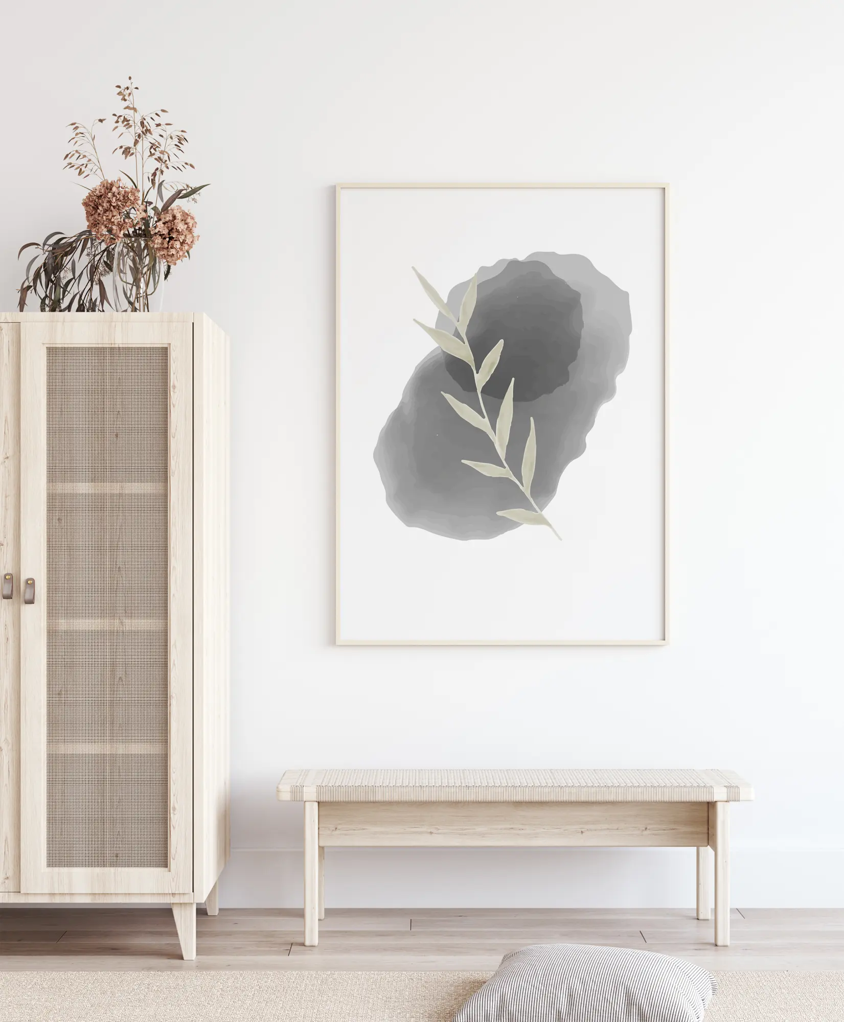 Paprasto dizaino smėlio spalvos lapas, padėtas ant ovalo formos akmens. Ant balto fono lapas guli ant dviejų skirtingų akmenų: mažo juodo akmens, padėto ant didesnio smėlio spalvos akmens. Suteikite savo namams subtilumo pojūtį su šiuo plakatu.