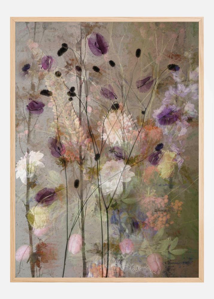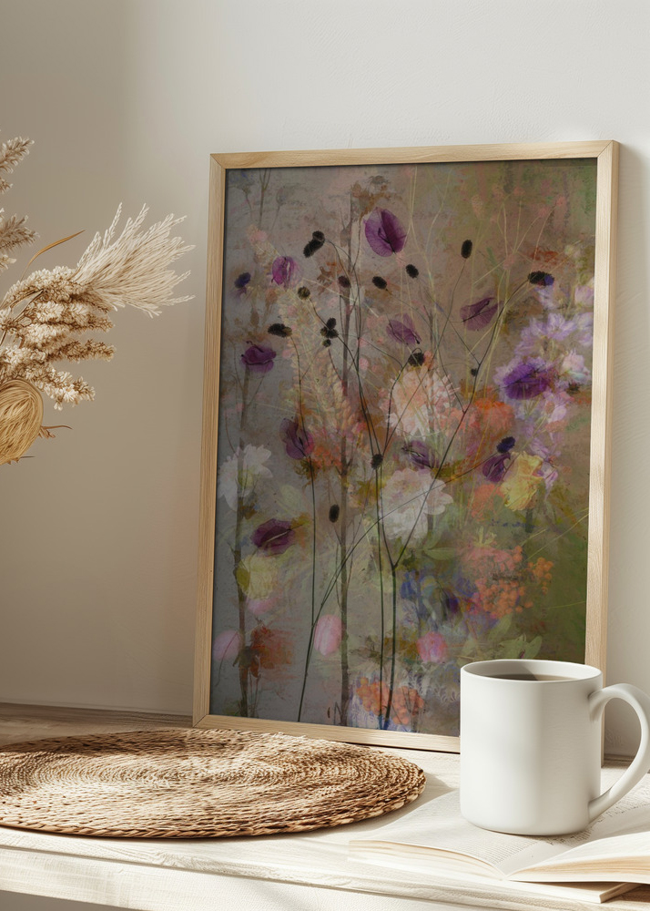 Nuostabus rankomis tapytas violetinių ir baltų džiovintų gėlių atspaudas. Naudojant smėlio spalvos foną, gėlių natūralios spalvos kuria atpalaiduojančią atmosferą. Švelnūs žali, violetiniai ir oranžiniai tonai labai malonūs akiai. Gražus plakatas, tinkantis šalia jūsų tualetinio staliuko.