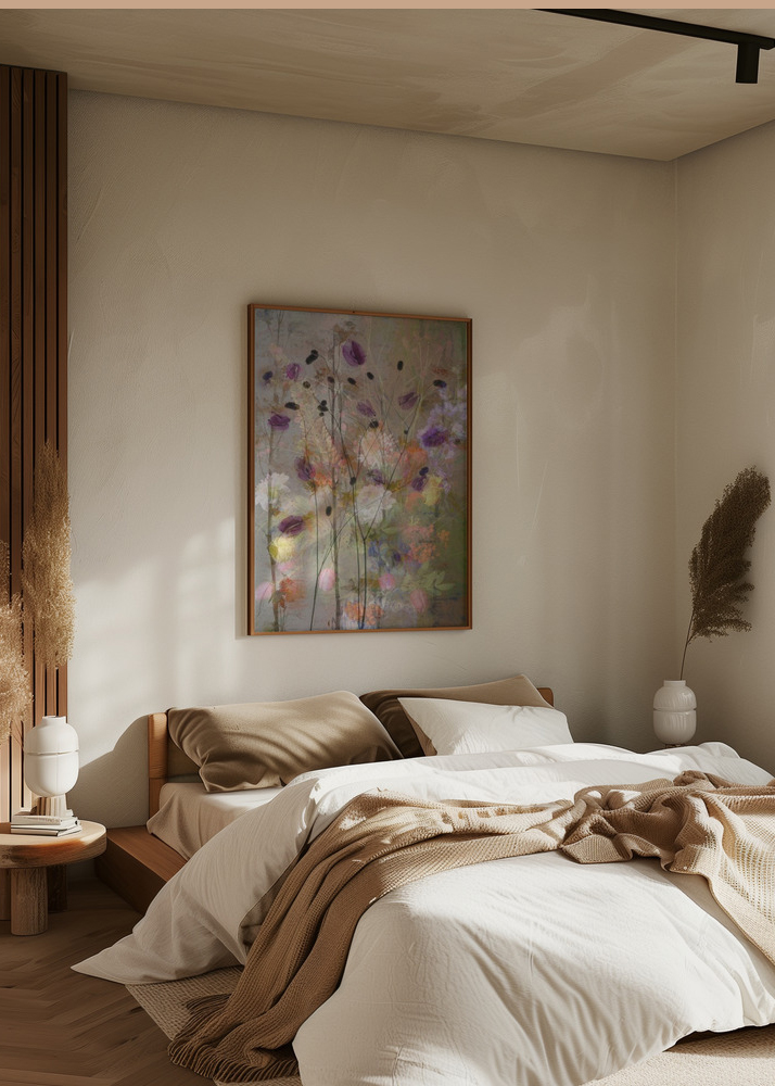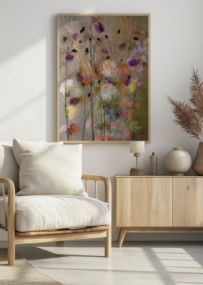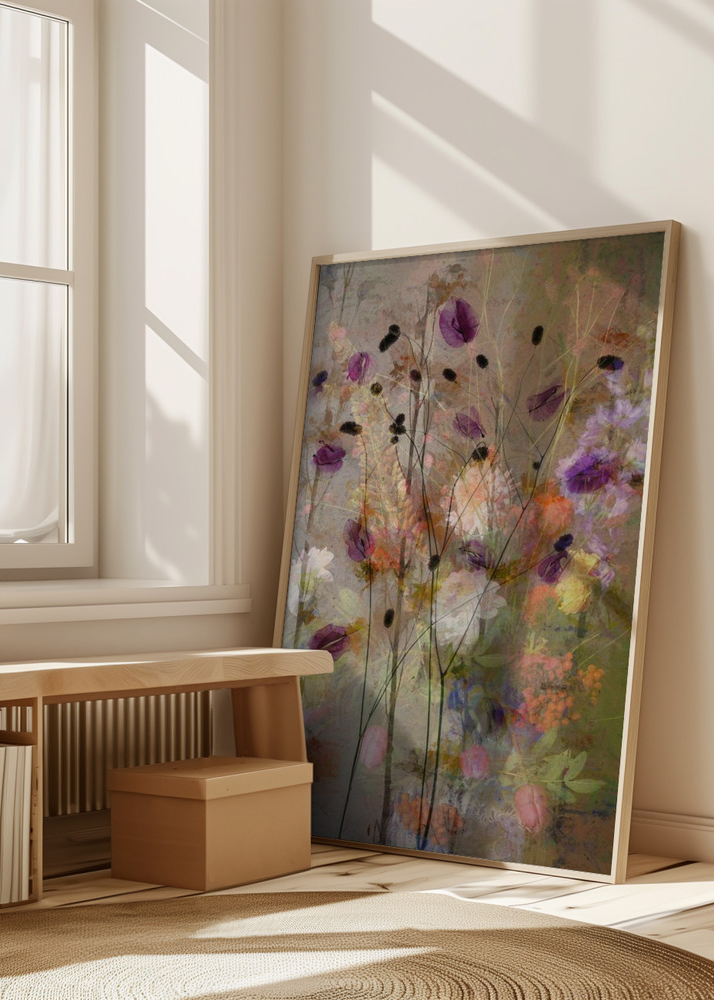 Nuostabus rankomis tapytas violetinių ir baltų džiovintų gėlių atspaudas. Ant smėlio spalvos fono gėlių natūralios spalvos sukuria atpalaiduojančią atmosferą. Švelnūs žali, violetiniai ir oranžiniai tonai yra labai švelnūs akiai. Gražus plakatas, tinkantis šalia jūsų tualetinio staliuko.