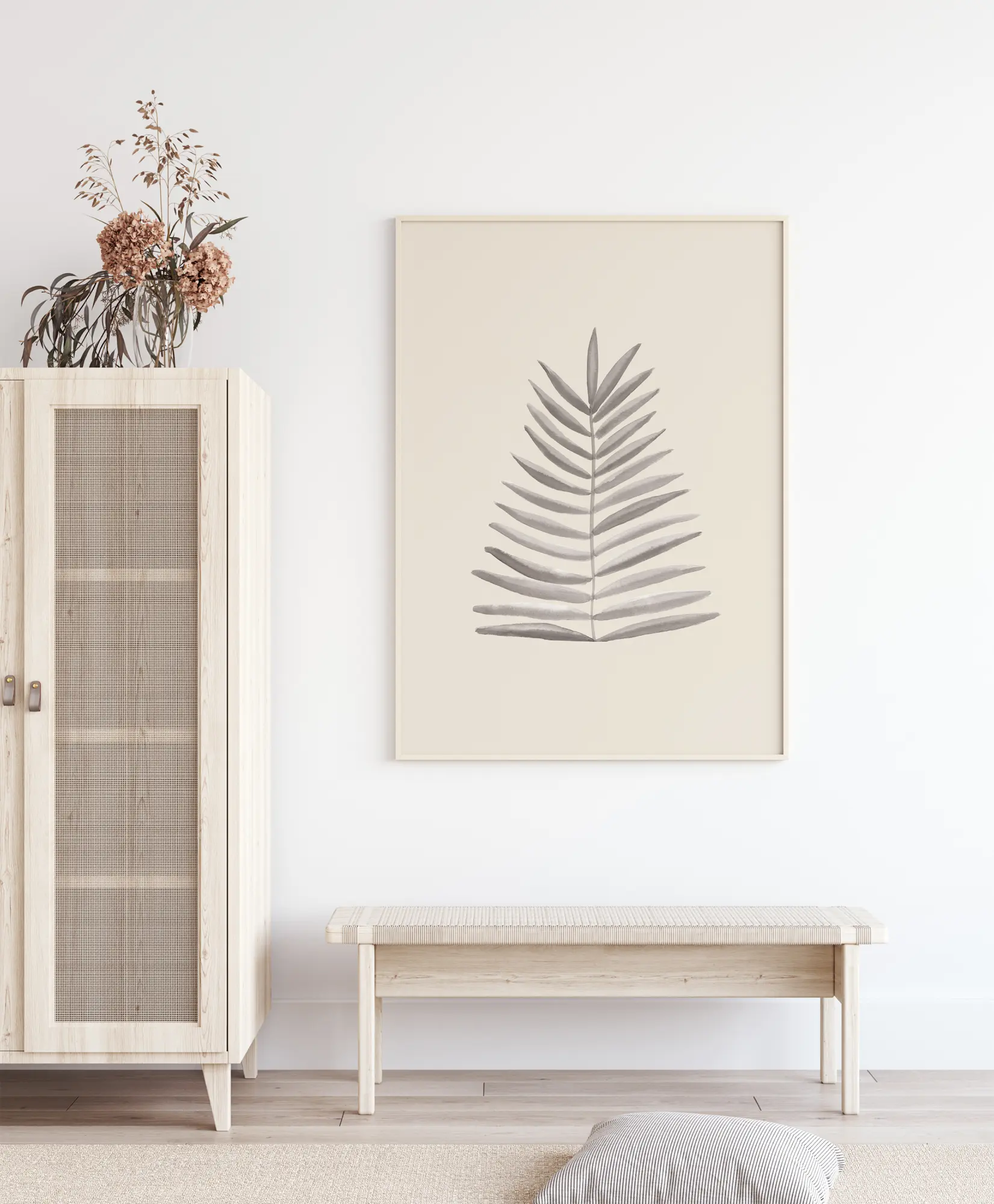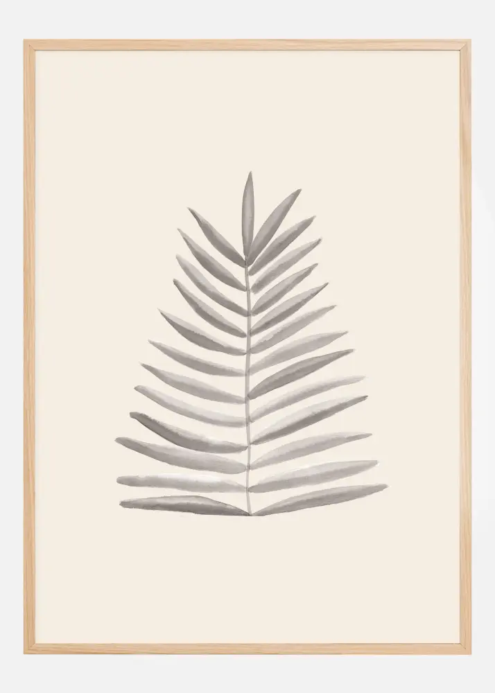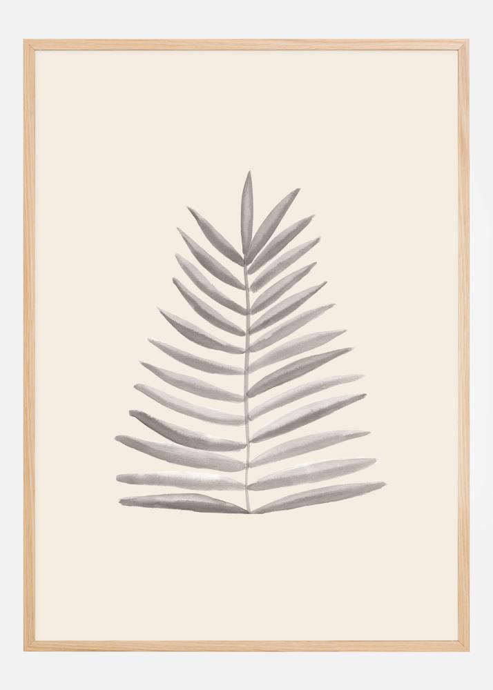 Paprastas, bet ryškus plakatas su palmių lapu. Nupieštas ant kreminės spalvos fono, lapas stovi vertikaliai ant savo koto. Kreminės spalvos fonas pabrėžia mažą rudą palmių lapą. Pridėkite šį klasės akcentą prie spalvotos sienos.