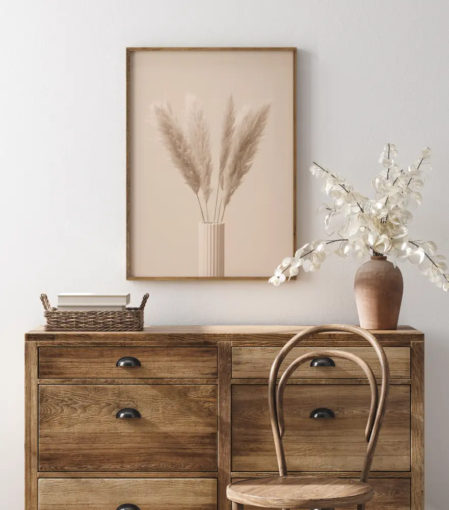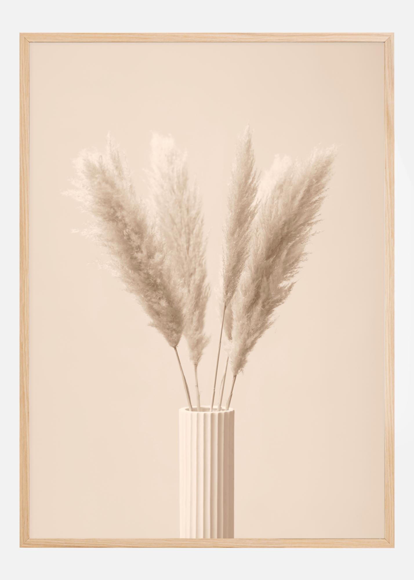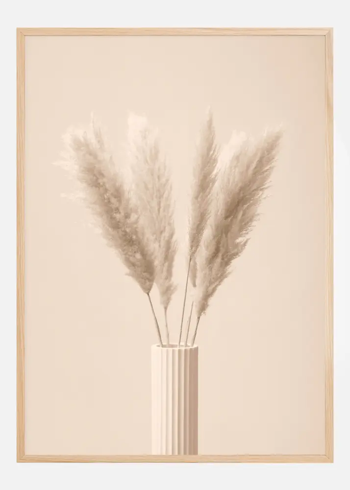 Gėlių plakatas su pampas žole vazone. Žolių viršūnės išsiskiria rožiniame sepijos fone, suteikdamos minkštumo pojūtį, kur vaza yra kietas elementas. Šis atvaizdas suteikia namams elegancijos.