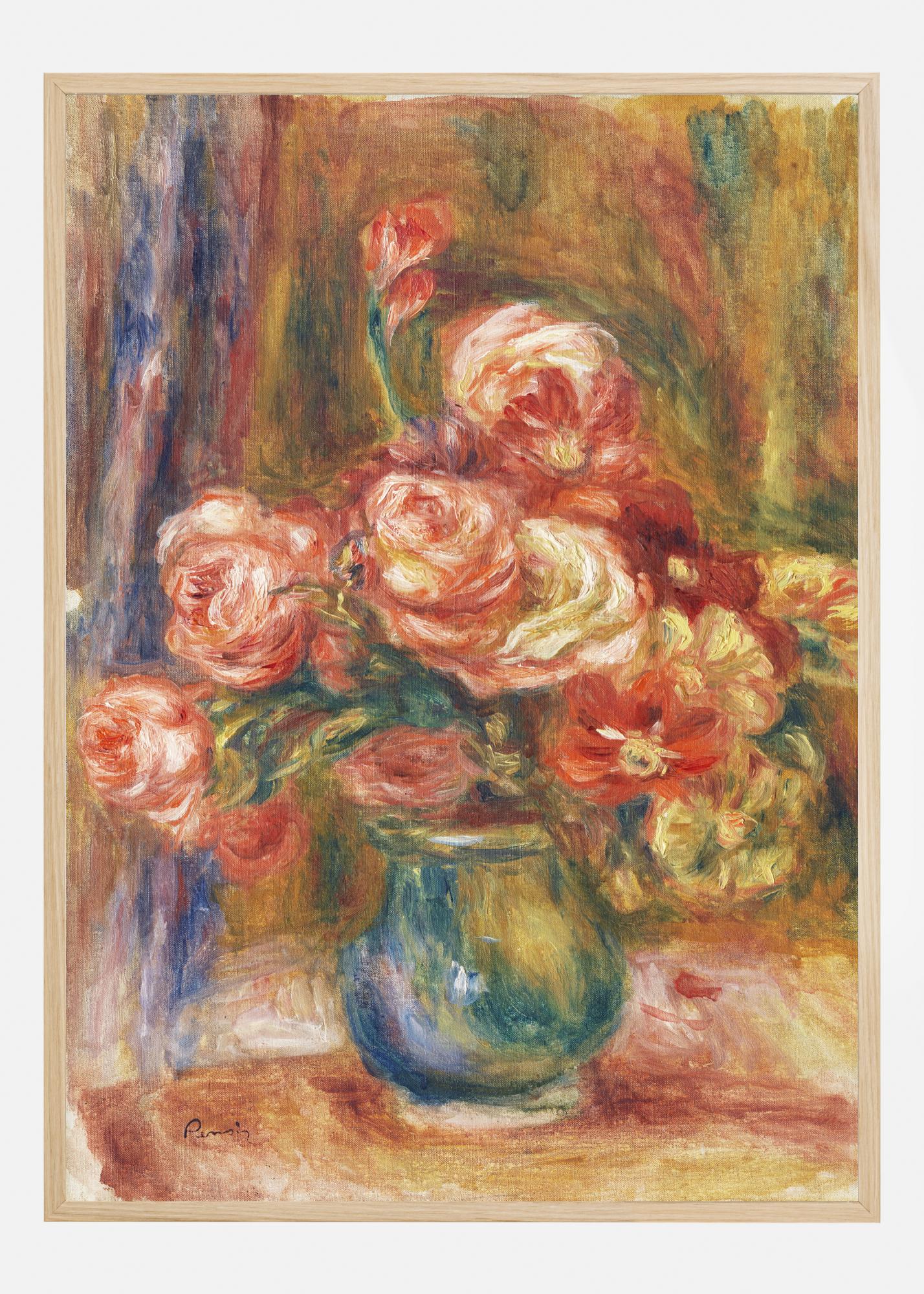 Graži rankomis tapyta rožių puokštė. Šis nuostabus oranžinių ir raudonų rožių atspaudas žalioje ir spalvotoje vazoje sukelia šiltą ir raminantį jausmą. Spalvų derinys įvairiaspalviame fone puikiai susilieja vienas su kitu. Padarykite savo namus švytinčius naudodamiesi šiuo puikiu plakatu.