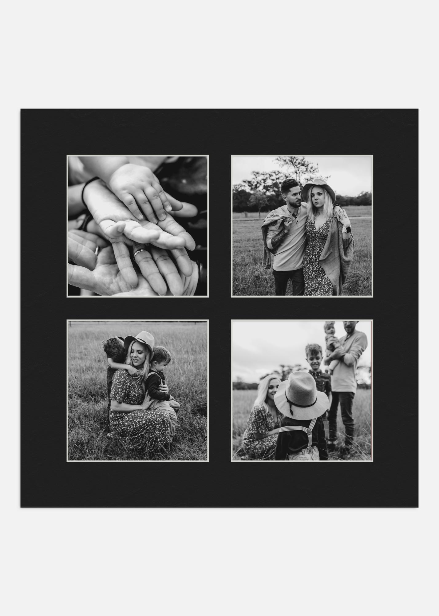 Rūgštims atsparus juodas koliažo paspartas su įstrižais baltais kraštais iš aukščiausios kokybės. Pasparte yra vietos 4 nuotraukoms. Puikiai tinka, kai norite sukurti savo asmeninį fotokoliažą.