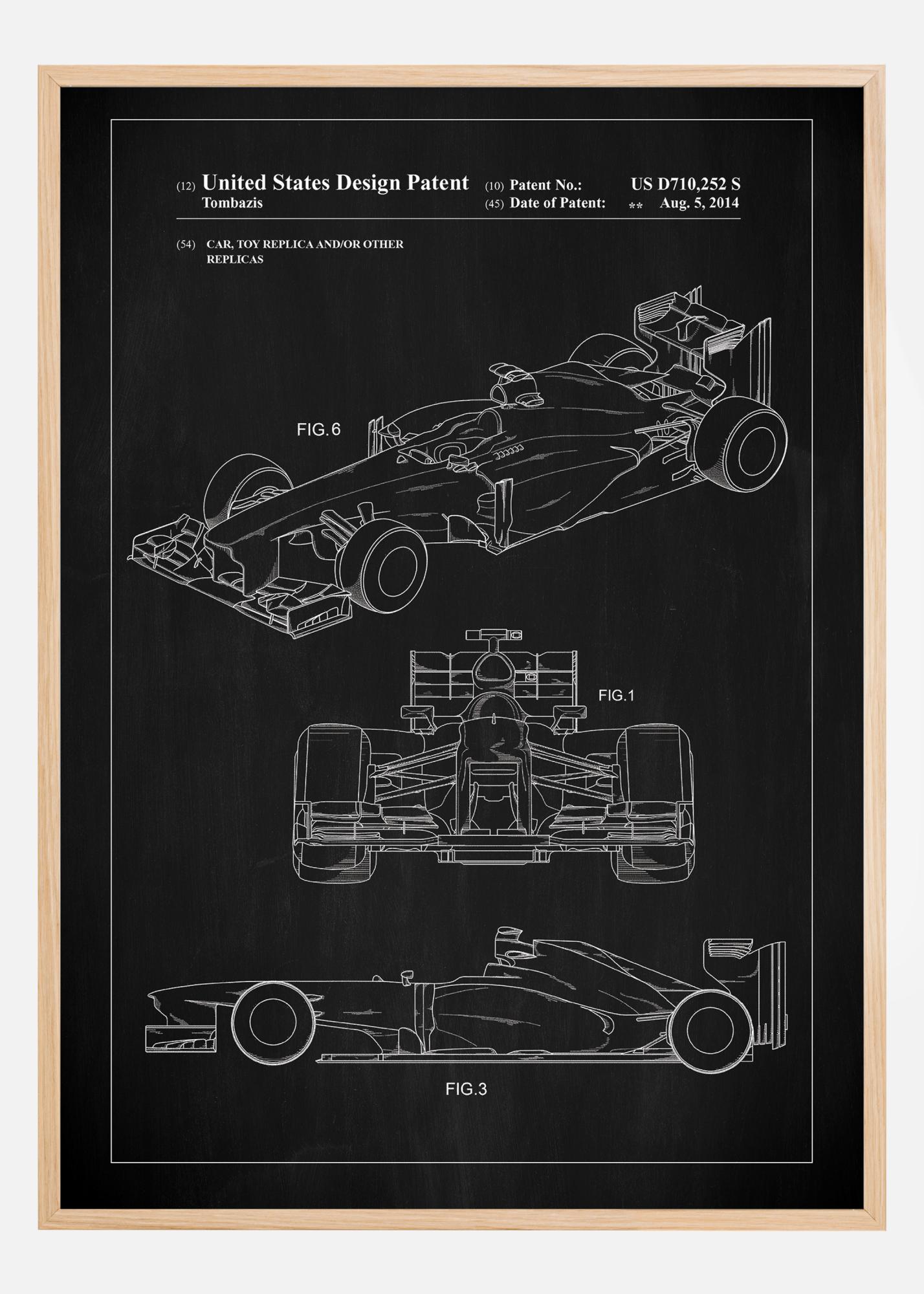 Ši patentinė afiša pabrėžia elegantišką ir sudėtingą „Formulės 1“ automobilio dizainą pagal JAV dizaino patentą US D710,252 S, datuotą 2014 m. rugpjūčio 5 d. Su savo išskirtinėmis linijomis ir aerodinaminėmis formomis, automobilio dizainas pateikiamas iš kelių perspektyvų, suteikiant visapusišką šio ikoniško ir techniškai pažangaus charakterio vaizdą. Šis dizainas yra esminis aukštam našumui ir greičiui, siejamam su formulės lenktynėmis.