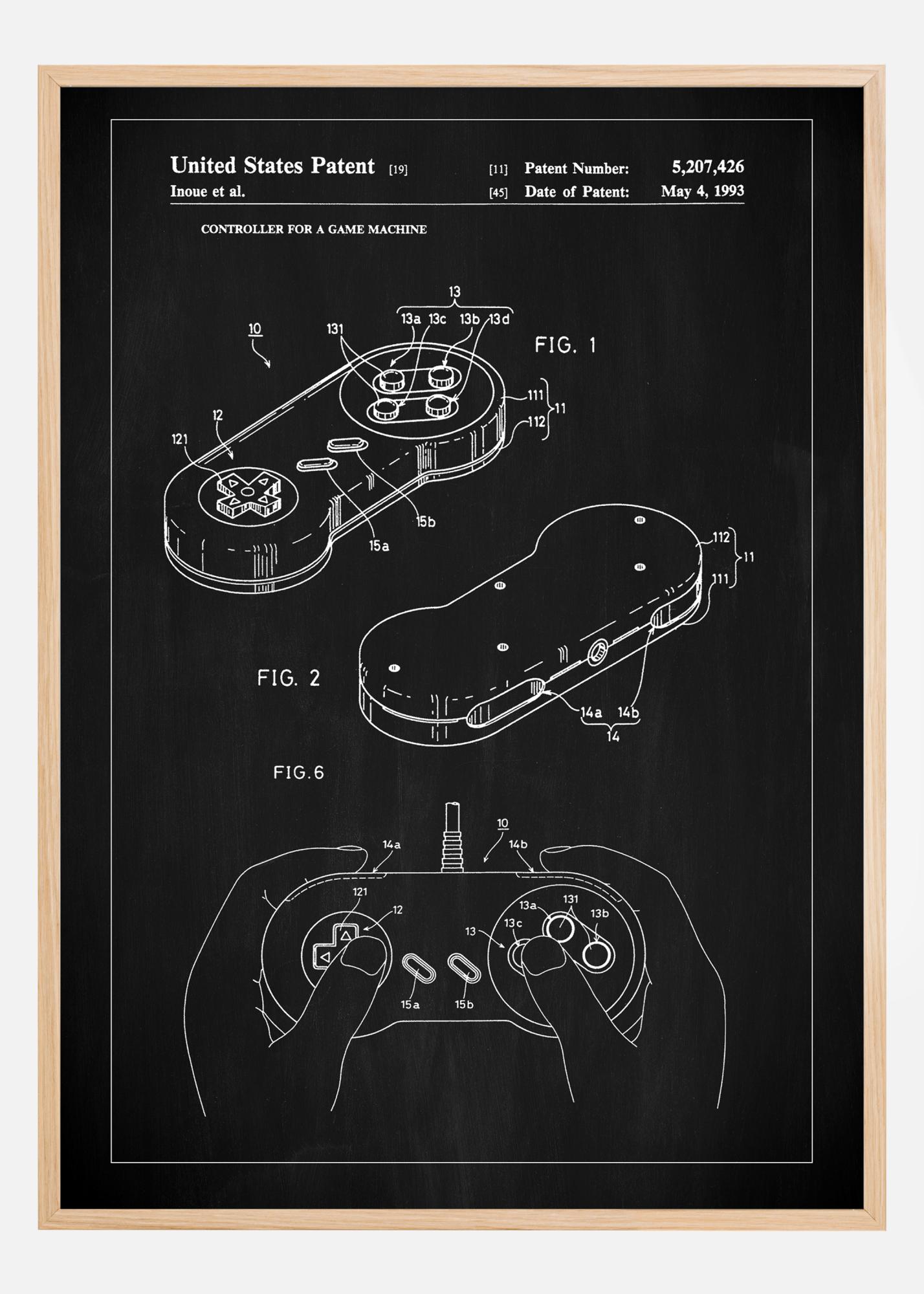 Šis patentinis plakatas pabrėžia klasikinį žaidimų pultelio dizainą Nintendo konsolei, patentas numeris 5,207,426, išduotas 1993 m. gegužės 4 d., stilingame juodos lentos fone. Patentiniai brėžiniai rodo skirtingus valdiklio vaizdus, įskaitant viršų, apačią ir vartotojo perspektyvą, detaliai vaizduojantys mygtukų ir svirčių dizainą, kurie tapo esminiais elementais žaidėjų sąveikoje su skaitmeniniu žaidimų pasauliu.