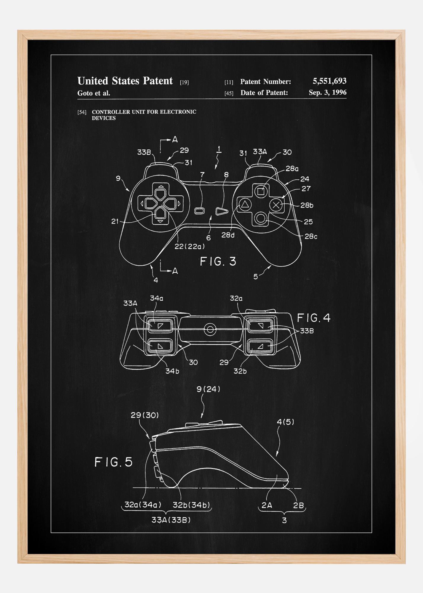 Šis patentinis plakatas pristato detalią "Playstation" žaidimų valdiklio, patentu numeris 5,551,693, datuoto 1996 metų rugsėjo 3 dieną, brėžinį su įspūdingu juodu lentos fonu. Kiekvienas mygtukas ir vairasvirtė yra kruopščiai iliustruoti, kad parodytų valdiklio ergonomišką dizainą ir vartotojo centrines funkcijas. Ši revoliucinė koncepcija turėjo reikšmingą įtaką vėliau sekusių žaidimų valdiklių dizainui ir prisidėjo prie žaidimų patirties formavimo, kokią ją žinome šiandien.