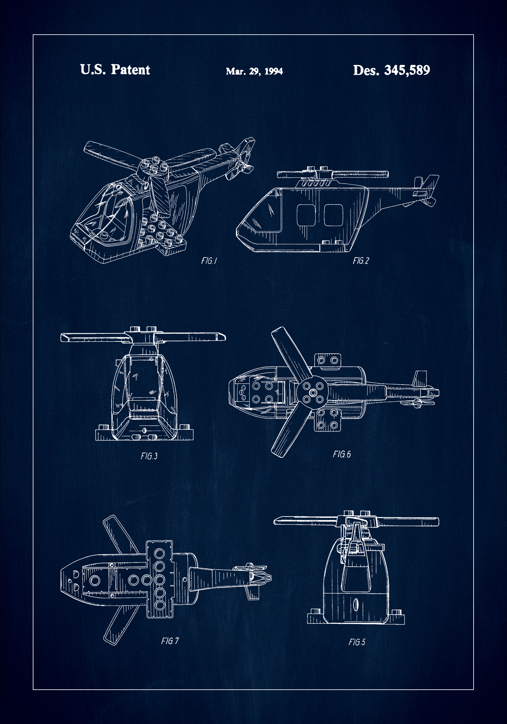 Šis išskirtinis patentinis plakatas vaizduoja estetinio ir funkcinio meistriškumo Lego sraigtasparnį, kuris yra JAV patento Des. 345,589, išduoto 1994 m. kovo 29 d. dalis. Tamsiai mėlynas fonas gražiai kontrastuoja su baltais linijomis, šis patentinis brėžinys užfiksuoja pažangios inžinerijos ir dizaino esmę. Tai yra duoklė inovacijoms ir idealiai tinka tiems, kurie vertina techninį subtilumą ir istoriškai įtakingą dizainą savo interjero pasirinkimuose.
