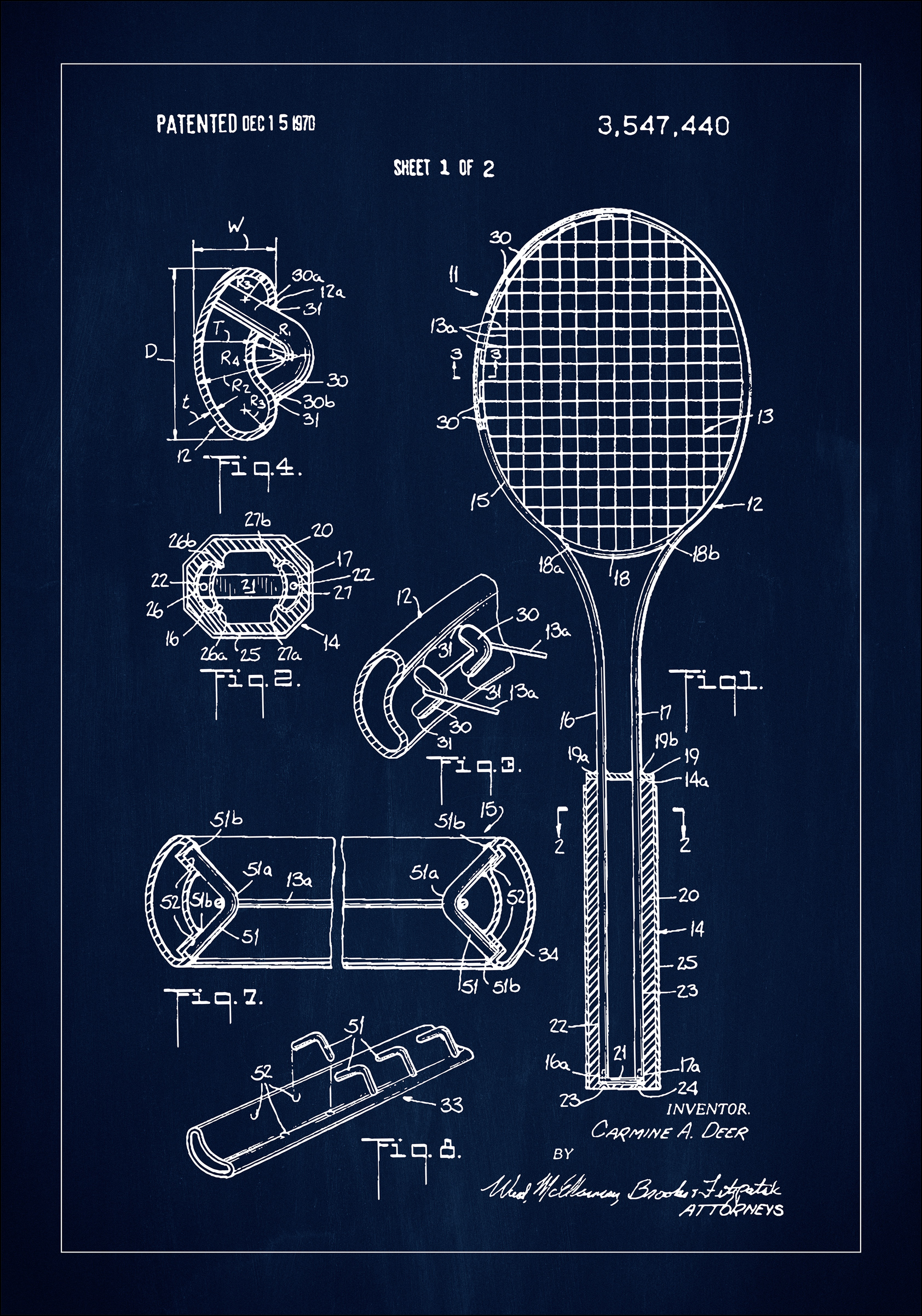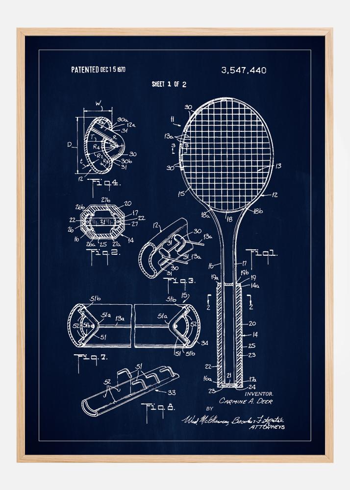 Šis patentinis plakatas atkartoja detalų juodai baltą techninį brėžinį iš Amerikos patento 3,547,440, išduoto 1970 m. gruodžio 15 d. Su savo rafinuota ir pramonine estetika, šis patentinis plakatas demonstruoja sudėtingą teniso raketės dizainą ir jos sudedamąsias dalis, įskaitant įvairius pjūvius ir perspektyvas, kurie išryškina inovacijas ir inžinerinį meistriškumą, slypintį už sporto įrangos.