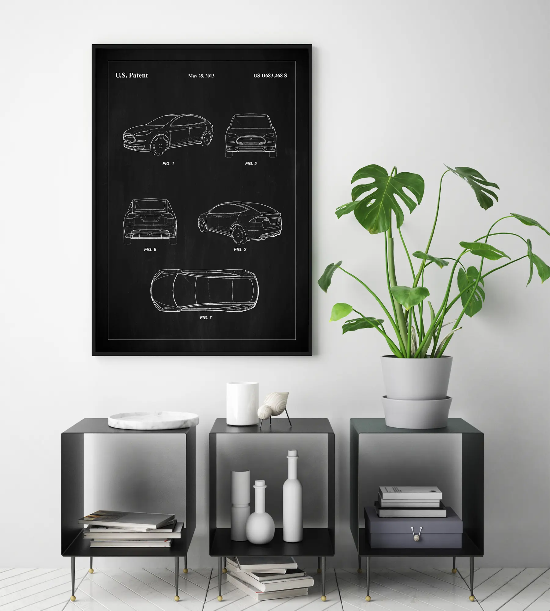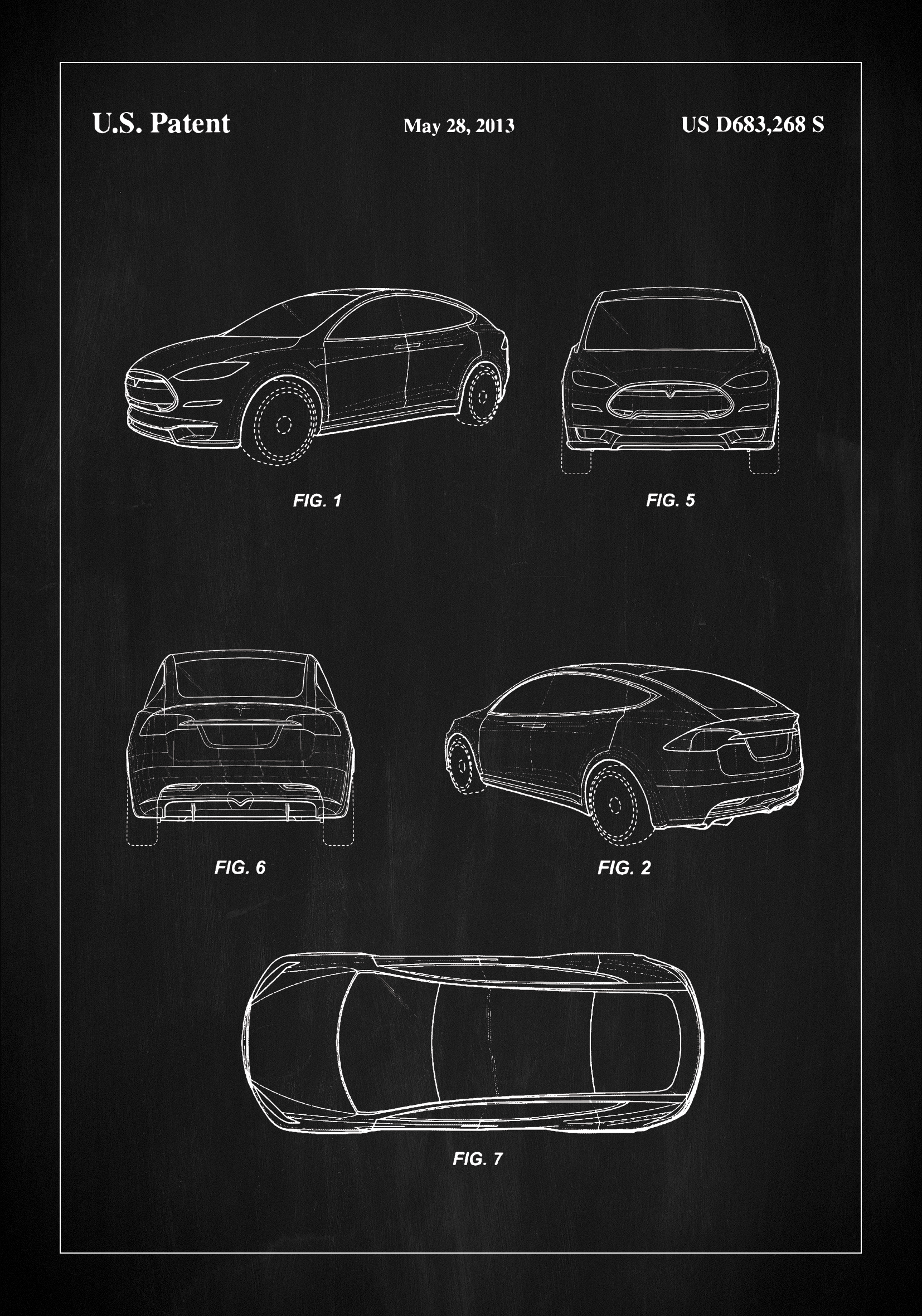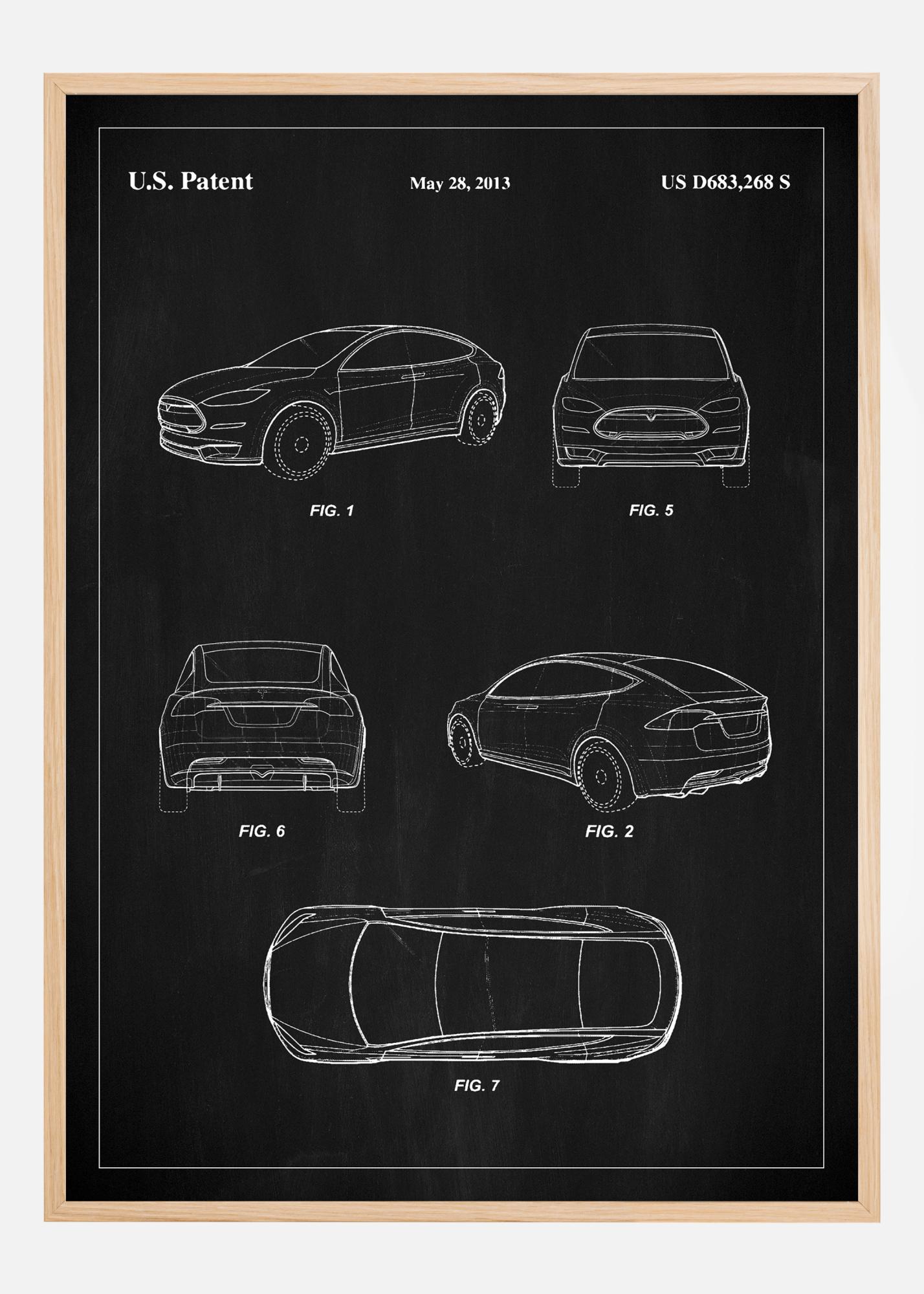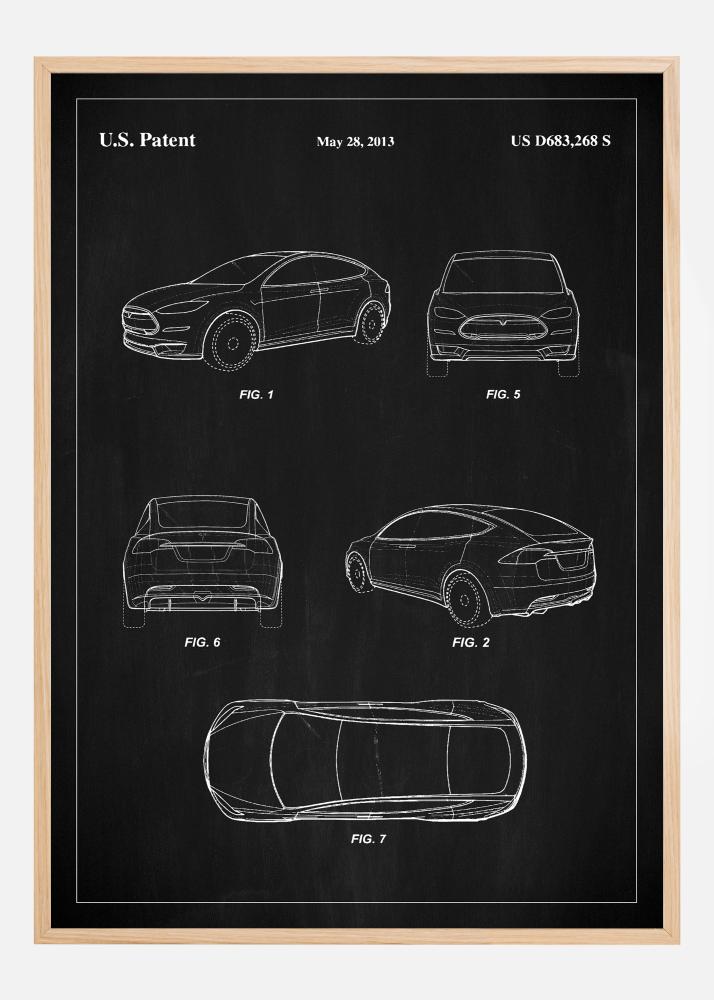 Šis elegantiškas ir rafinuotas patentinis plakatas yra modernios „Tesla“ automobilių dizaino duoklė, kaip užfiksuota Amerikos patento numeriu US D683,268 S 2013 m. gegužės 28 d. Plakatas rodo išskirtinę automobilio skulptūrą, kuri apibrėžia automobilių gamybos pažangą. Kiekviena linija ir kreivė kruopščiai nupiešta balta spalva ant juodos lentos, sukuriant didingą kontrastą, kuris prikausto ir laiko žiūrovo dėmesį.