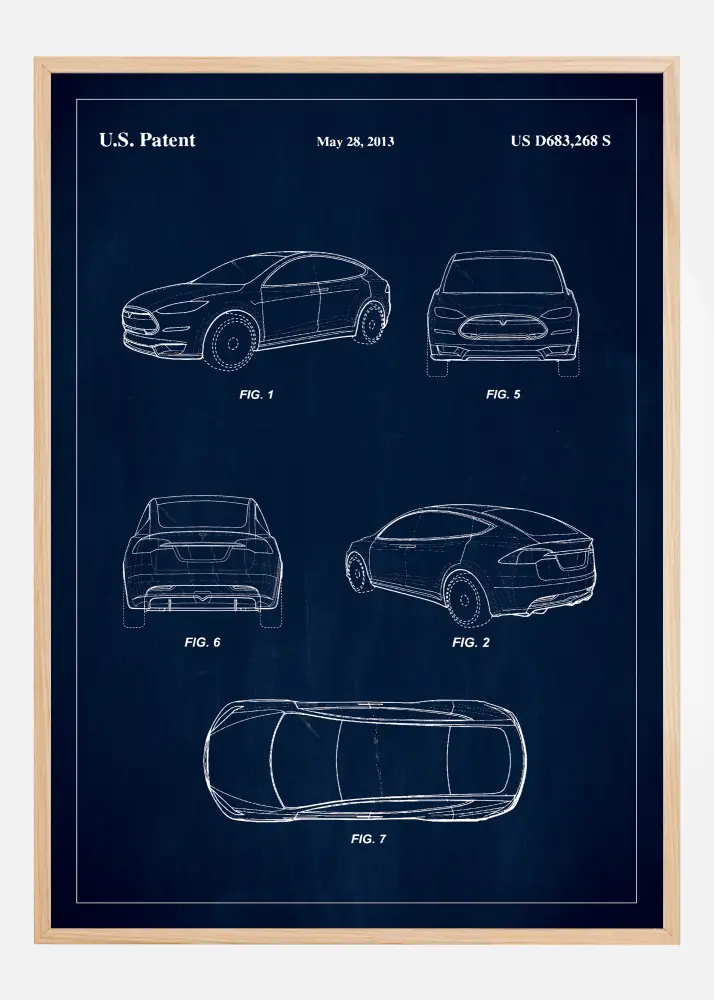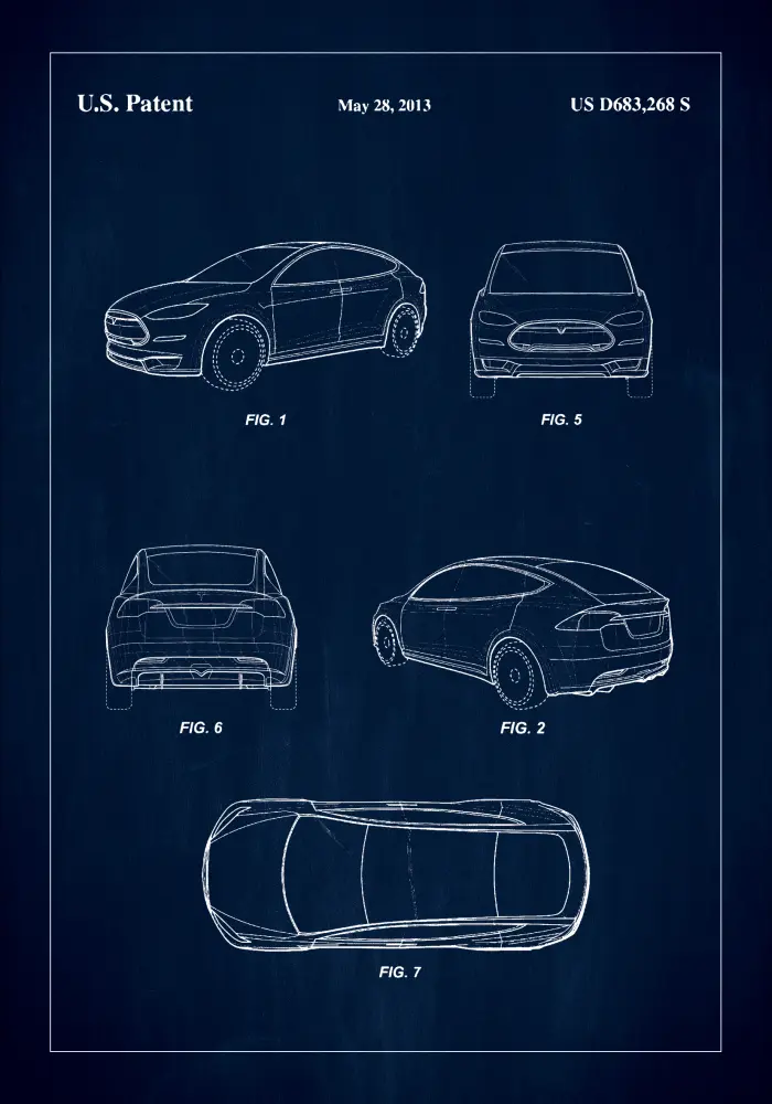 Didžiuojamės pristatydami šį patentų plakatą, grafiškai vaizduojantį JAV patentą D683,268 S, išduotą 2013 m. gegužės 28 d., kuris pavaizduoja Tesla automobilio dizainą, kuris yra toks pat novatoriškas, kaip ir estetiškai patrauklus. Plakatas yra idealus papildymas bet kuriems kolekcininkų namams ar darbo vietai, pasiūlantis unikalią įžvalgą į dizaino procesą, slypintį už vienos iš žymiausių figūrų automobilių pramonėje.