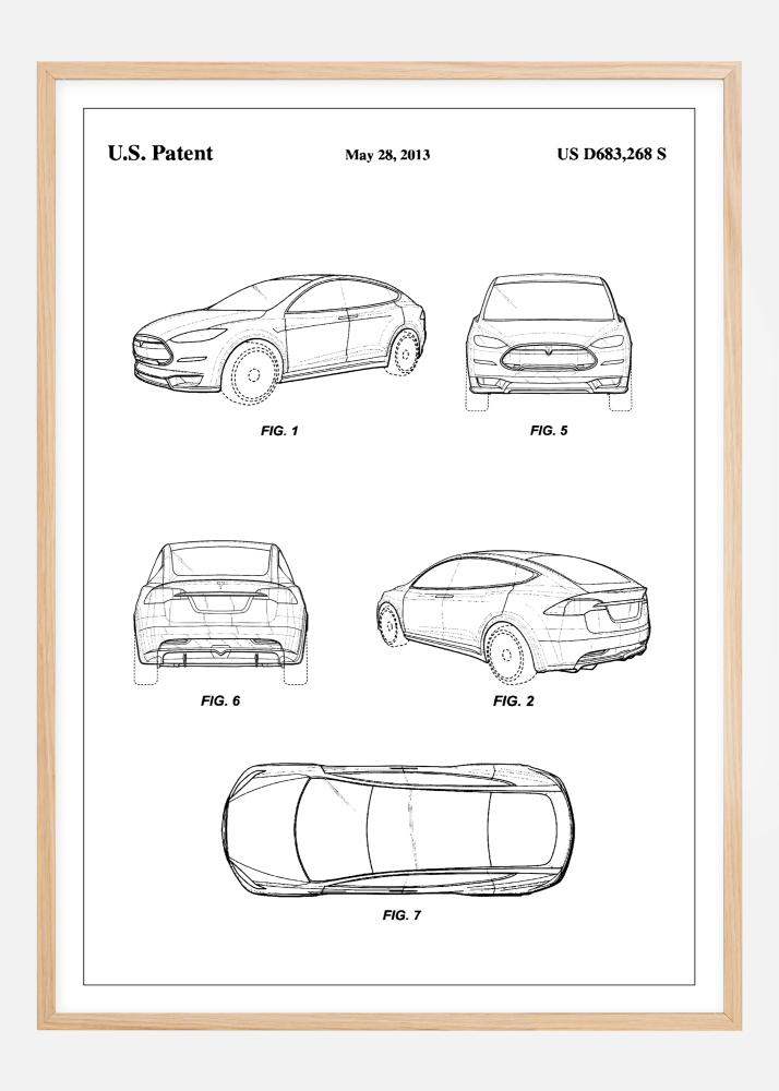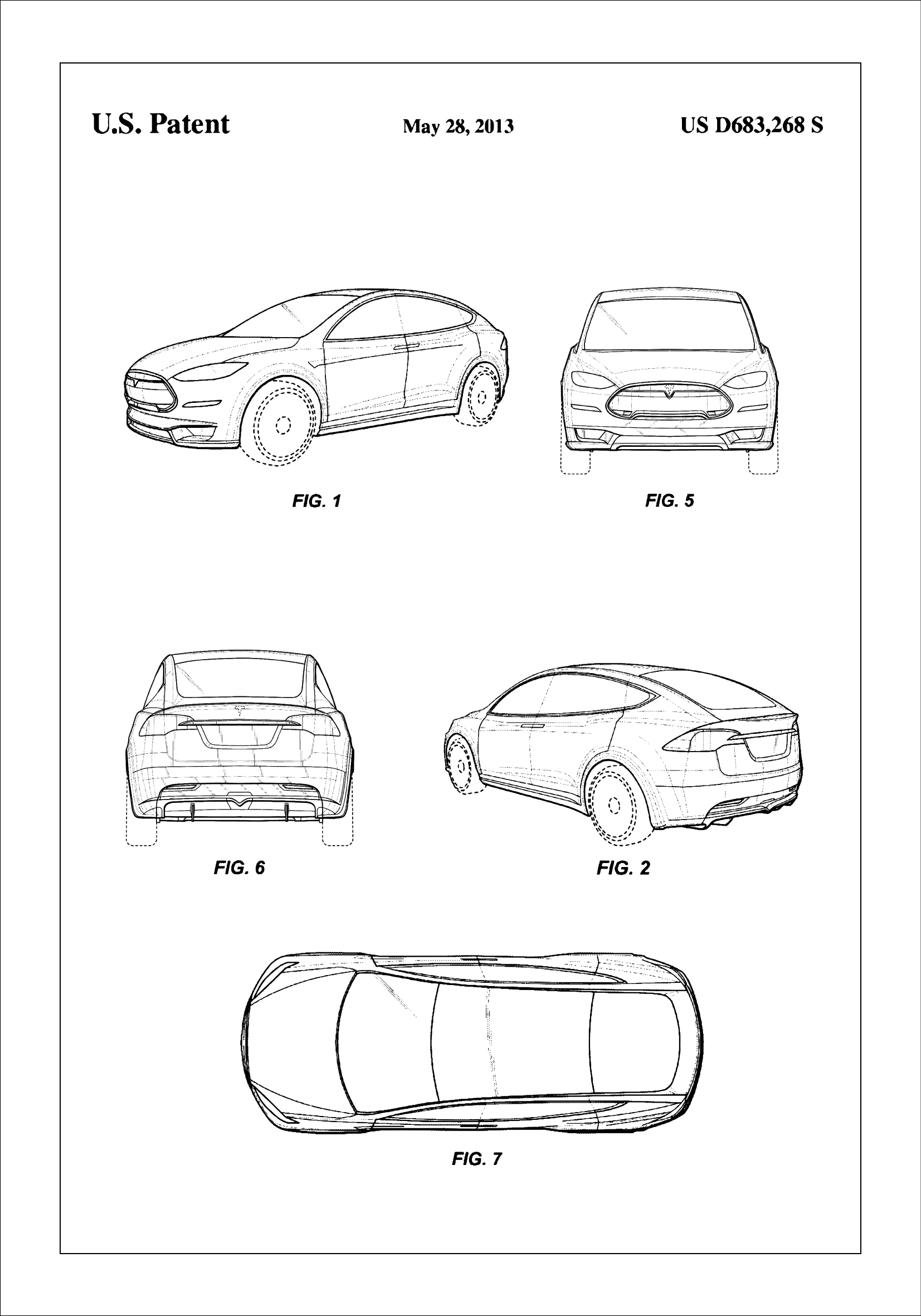 Atraskite inovacijų ir stiliaus pasaulį su šiuo išskirtiniu Tesla patento plakatu, kuriame išdidžiai nurodytas patento numeris US D683,268 S, suteiktas 2013 m. gegužės 28 d. Šis minimalistinis ir elegantiškas patento plakatas pabrėžia revoliucinį transporto priemonės dizainą, kuris atspindi technologijų viršūnę ir pramoninį dizainą. Plakatas traukia dėmesį savo ryškiomis linijomis ir tiksliais detalumais, todėl tampa išskirtine interjero detale bet kokiame moderniame namuose ar biure.