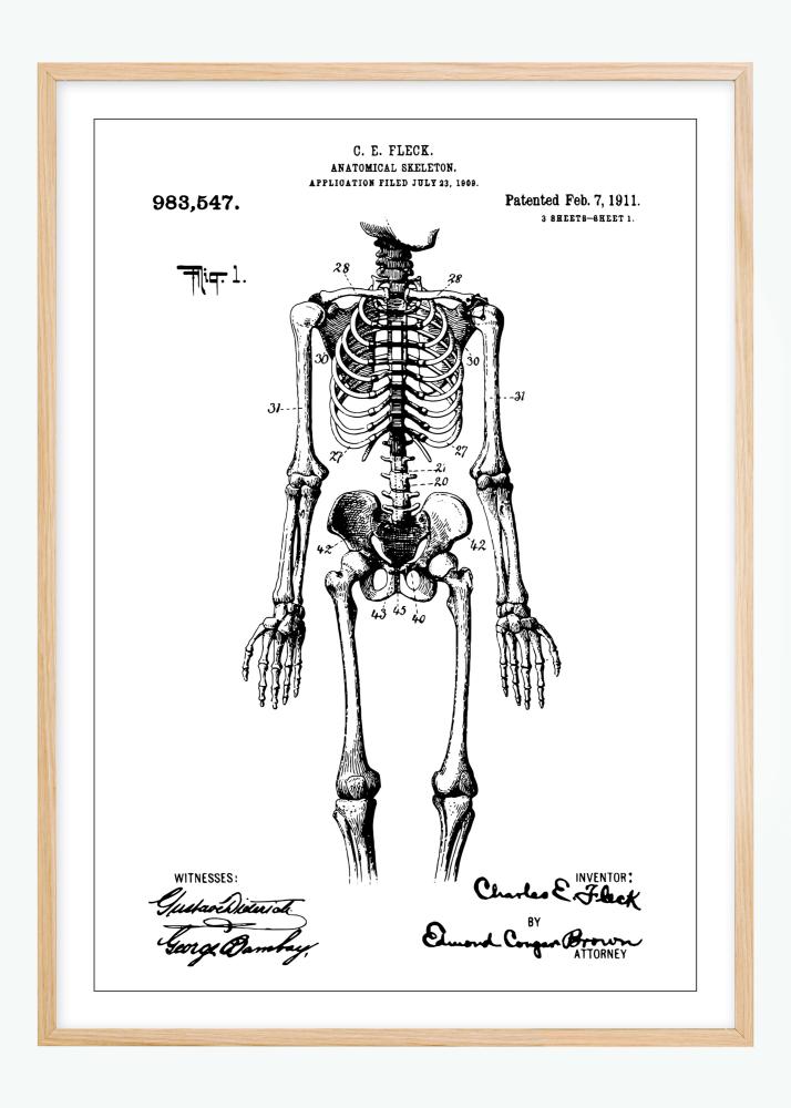 Šis edukacinis ir detalus patentinis plakatas pristato anatominį skeleto modelį, kuris iliustruotas patente numeriu 983,547. Patentas buvo suteiktas 1911 m. vasario 7 d. C. E. Fleck, ir yra įdomus ankstyvos medicinos pedagogikos ir dizaino pavyzdys. FIG. 1 rodo skeletą pilnoje formoje, suteikiant aiškią kūno struktūros ir kaulų išsidėstymo apžvalgą.