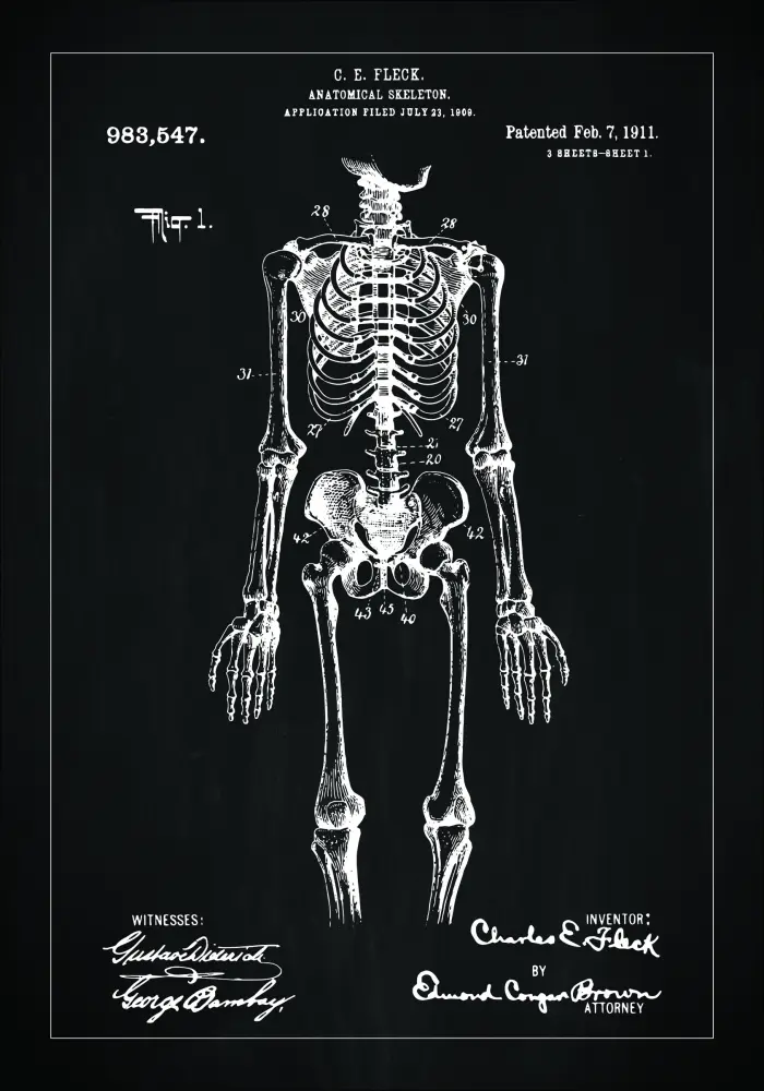 Šis žavus patentų plakatas vaizduoja patentą numeriu 983,547, išduotą C. E. Fleck 1911 m. vasario 7 d., už anatomiškai teisingą skeleto modelį. Kiekvienas kaulas ir struktūra išradingai išraižyta baltomis linijomis ant išskirtinio juodo fono, sukuriant vizualinį efektą, kuris yra ir mokomasis, ir meninis. Tai įspūdinga iliustracija, rodanti žmogaus kūno stebuklus ir sudėtingumą.