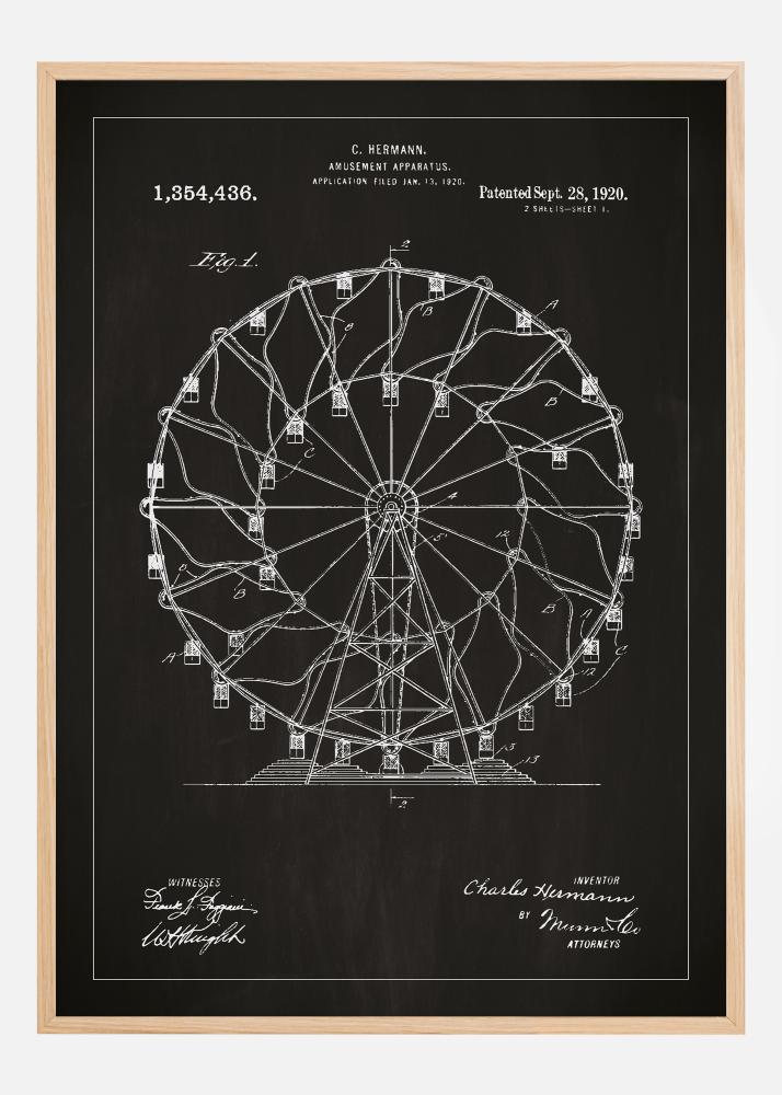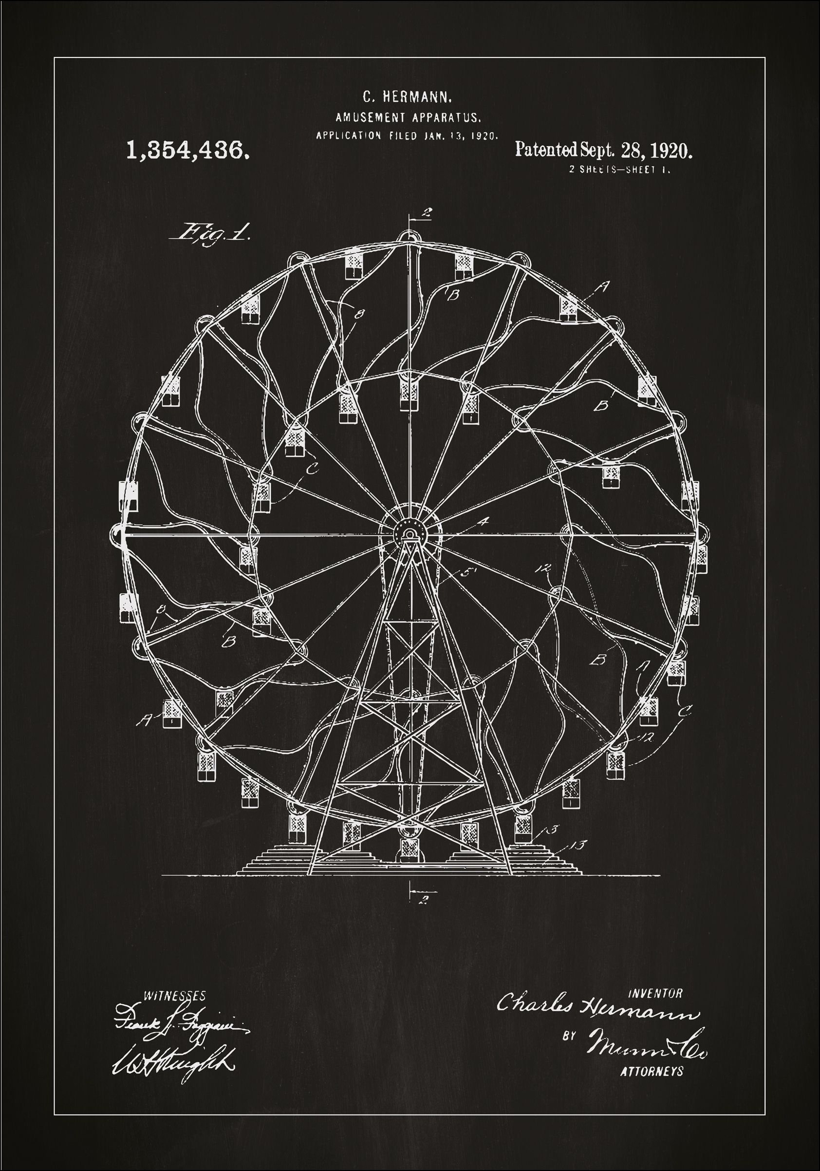 Šis patentų plakatas pristato C. Hermanns klasikinį atrakcionų parko konstrukciją, specifikuotą patente numeriu 1,354,436, išduotą 1920 m. rugsėjo 28 d. Su detalia apvaizda paryžiaus rato, šis brėžinys simbolizuoja žaidimų inovacijų erą ir yra nuostabus interjero elementas visiems, turintiems širdį istoriniams linksmybių gyvenimui ir technologijoms. Įmantrus dizainas ir detalus apipavidalinimas prikausto dėmesį ir suteikia nostalgijos jausmą.