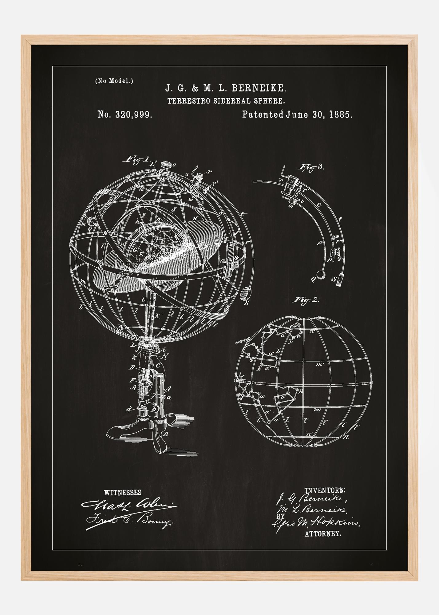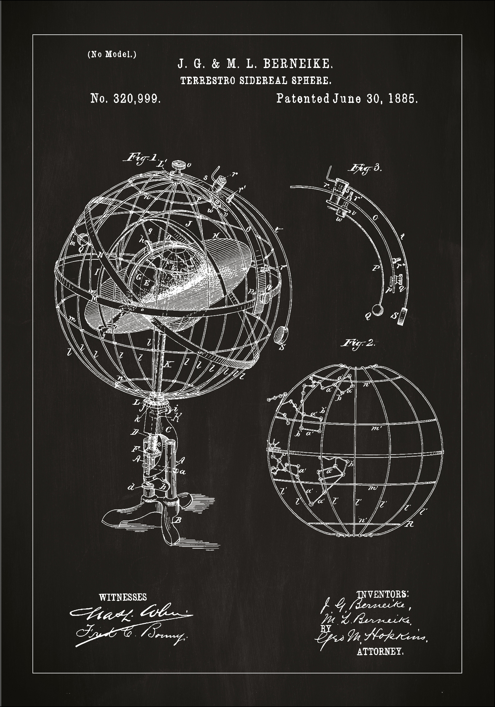 Šis unikalus patento plakatas pristato išradingą ir detalią patentuotą Terrare Sidereal Sphere brėžinį, patentuotą 1885 m. birželio 30 d. J.G. & M.L. Berenike. Šiame sudėtingame dizaine atsispindi XIX amžiaus inovacijų techninė meistrystė ir suteikia istorijos dvelksmą. Iliustracija sudaryta iš sudėtingų geometrinių formų, kurios kartu kuria dangaus kūnų judėjimo modelį, atsižvelgiant į žemę, ir atspindi to laikotarpio įdomias astronomines žinias.