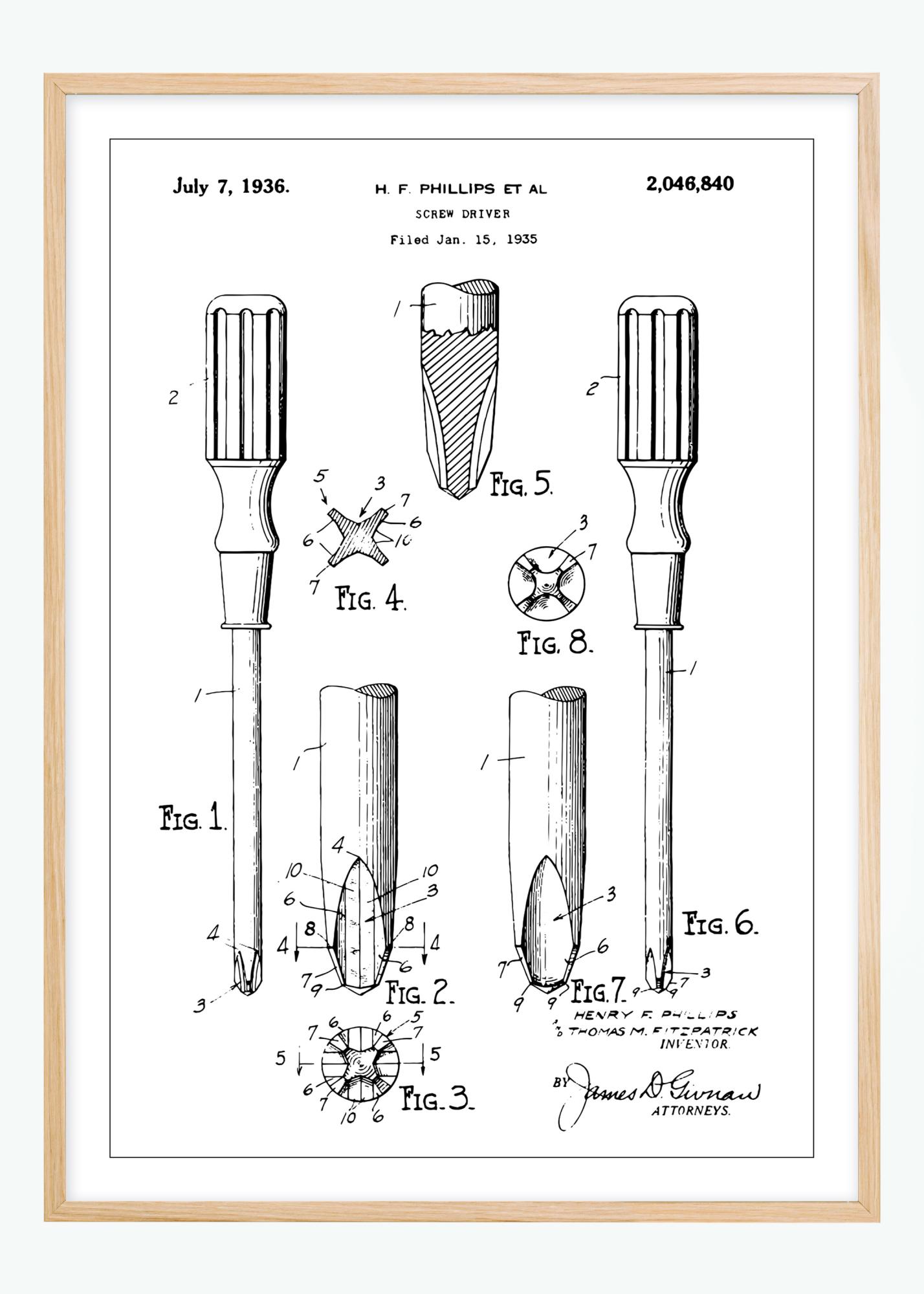 Pateikiamas čia yra klasikinis patentinis plakatas, vaizduojantis atsuktuvą, nepakeičiamą įrankį kiekvieno meistro įrankių dėžėje. Datavimas vyksta 1936 m. liepos 7 d. ir archyvuotas 1935 m. sausio 15 d., Šis patentinis plakatas tiksliai parodo įrankio konstrukciją ir inovaciją, nuo jo ikoniškos rankenos iki unikalaus galo formos. Išradėjai H.F. Phillips ir kiti su šiuo patentu, numeris 2,046,840, sukūrė standartą įrankių pramonėje, kuriuo mes vis dar pasitikime šiandien.