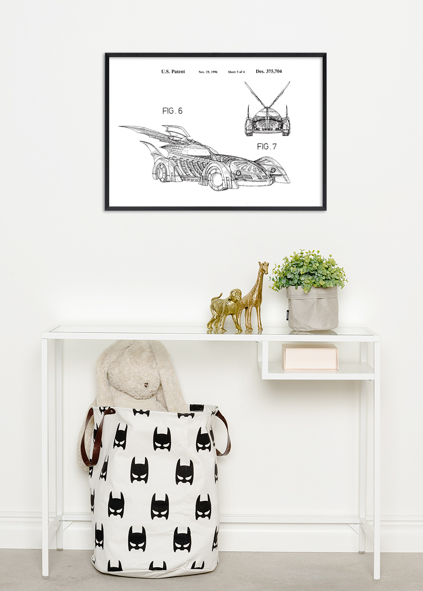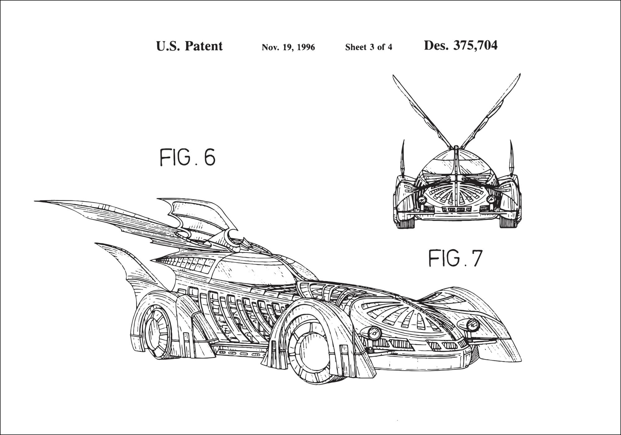 Su drąsiu ir įdomus vaizdu, ši patentinė aficija siūlo išskirtinį žvilgsnį į dizaino procesą už nepaprasto transporto priemonės. Amerikos patento Des. 375,704, išduoto 1996 m. lapkričio 19 d., FIG. 6 ir FIG. 7 parodo du skirtingus Batmobilo perspektyvas, su išsiskiriančia aerodinamika siluetu ir dramatišku stiliumi. Šios patentinės brėžinys detalės, nuo slenkančių linijų iki didelių, puošnių sparnų, daro ją nepamainomu interjero elementu kolekcionieriams ir dizaino entuziastams.