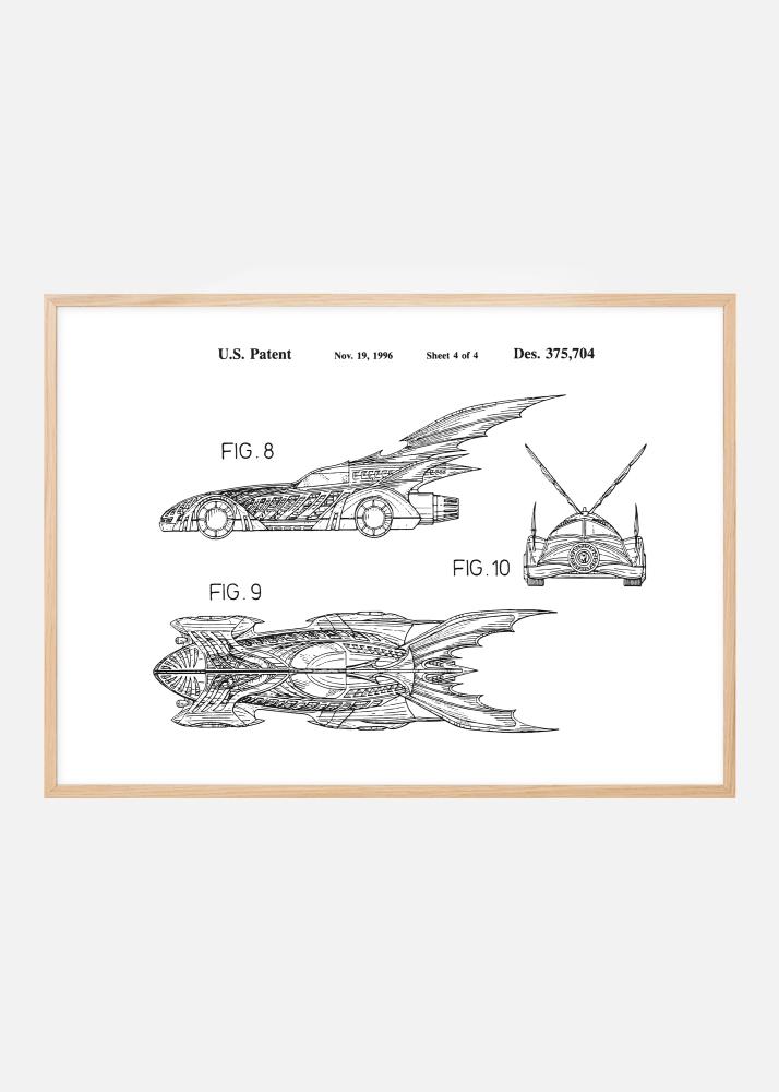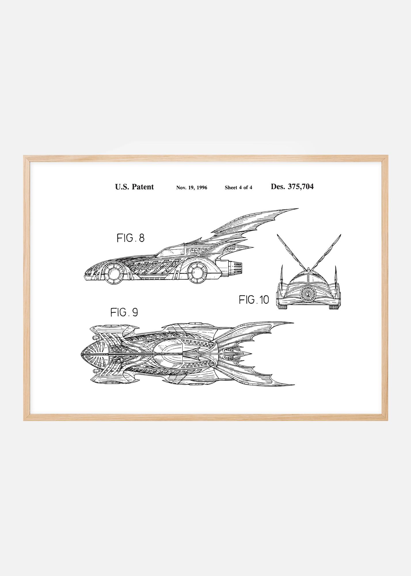 Šis patentinis plakatas užfiksuoja futuristinio dizaino ir išradingumo esmę. Tai yra JAV patento Des. 375,704 dalis, išduota 1996 m. lapkričio 19 d. Su trimis skirtingais Betmeno automobilio vaizdais, ši patentinė schema yra ateities vizijų išraiška, kurią dizaineris įsivaizdavo. Kiekviena figūra atskleidžia detalias ir apgalvotas dalių automobilio konstrukcijoje, nuo aptakių šoninių plokščių iki ikoninių sparnų, kurie tęsiasi nuo galo, tai yra ikoninė interjero detalė kiekvienam, kas vertina dizainą ir inovacijas.
