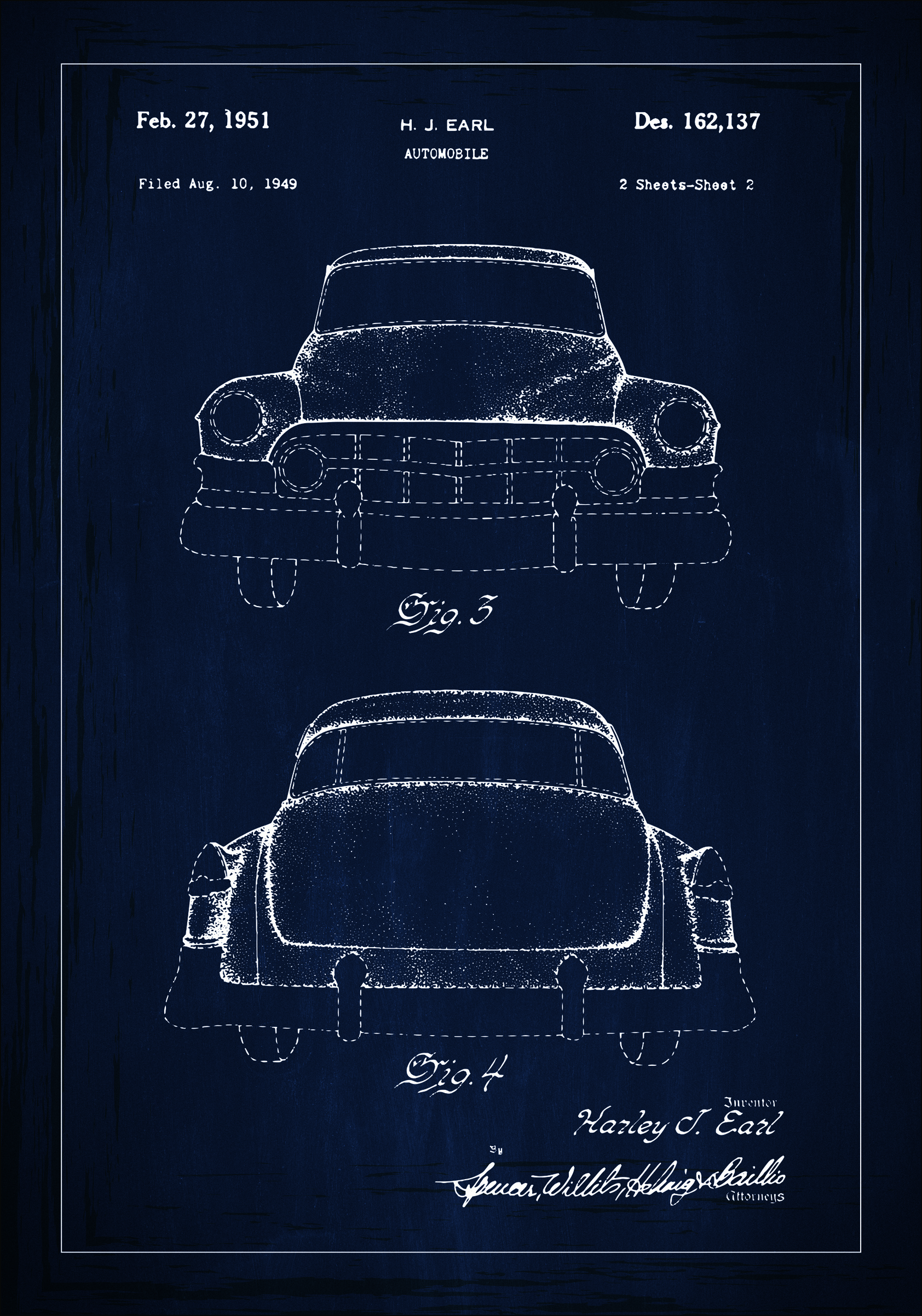 Šis patentuotas plakatas iliustruoja klasikinį automobilį iš „Cladillac“, transporto priemonę, kuri yra vidurio 20 amžiaus dizaino ir inovacijų simbolis. Patentavo 1951 m. vasario 27 d. H.J. Earl su patentu Nr. Des. 162,137, ir jis rodo automobilio formą tiek iš priekio, tiek iš galo. Tai buvo ikoniškas laikotarpis automobilių pramonei, ir šis automobilio modelis atspindi estetiką ir dizainą, kurie turėjo ilgalaikį poveikį vėlesnėms automobilių kartoms.
